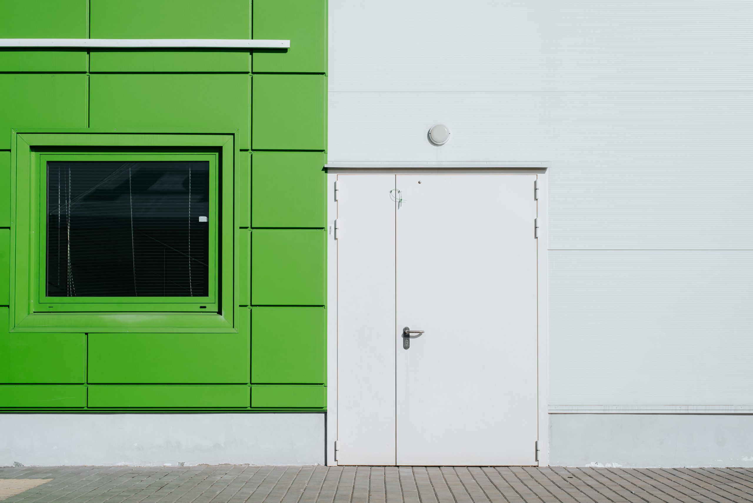 Exterior of modern industrial building, closed white door and window. Emergency exit or entrance, frontal view on sunny day outdoors.