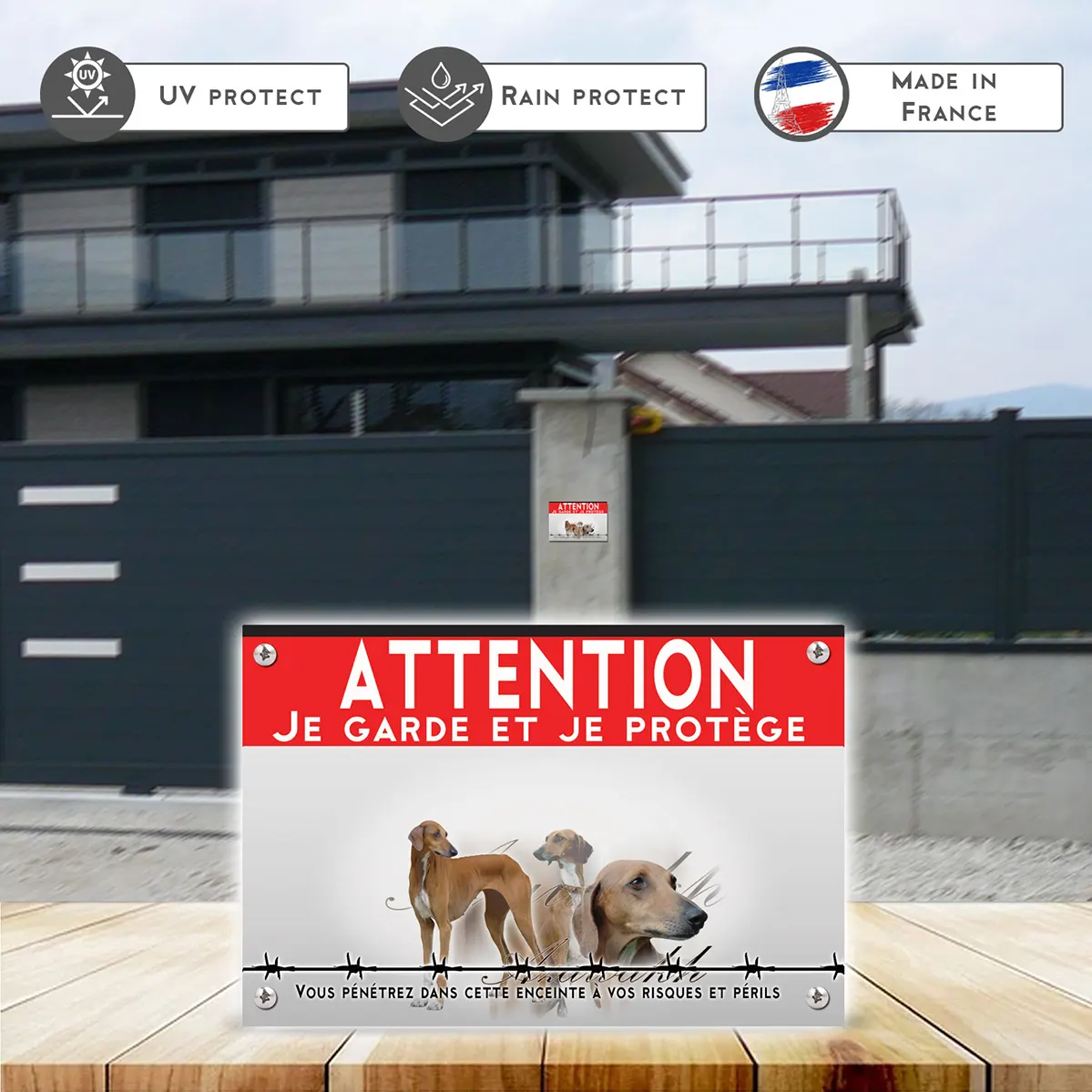 Le panneau « Attention au chien » se distingue par un fond principalement argenté, mettant en valeur des illustrations de lévriers azawakh. Un bandeau rouge vif au sommet porte le message « ATTENTION » en lettres capitales blanches, assurant une forte visibilité. Trois représentations de lévriers azawakh, dont un en gros plan aux traits doux et alertes, évoquent protection et vigilance. Des barbelés en bas symbolisent la clôture, tandis que le texte « Vous pénétrez dans cette enceinte à vos risques et périls » renforce le message d’avertissement. Ce visuel, à la fois sérieux et esthétiquement plaisant, attire tous les regards tout en communiquant un sentiment de sécurité.