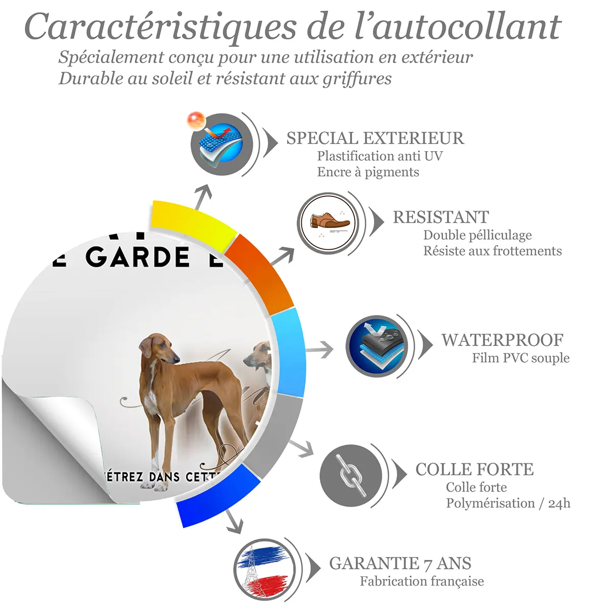 Affichez avec force et élégance la présence de votre Azawakh. Ce panneau Attention au Chien Azawakh de la Gamme Impact, disponible en métal Dibond et autocollant résistant aux intempéries et imprimé en UV, offre un contraste puissant pour une lisibilité immédiate et une dissuasion polie à l’entrée.