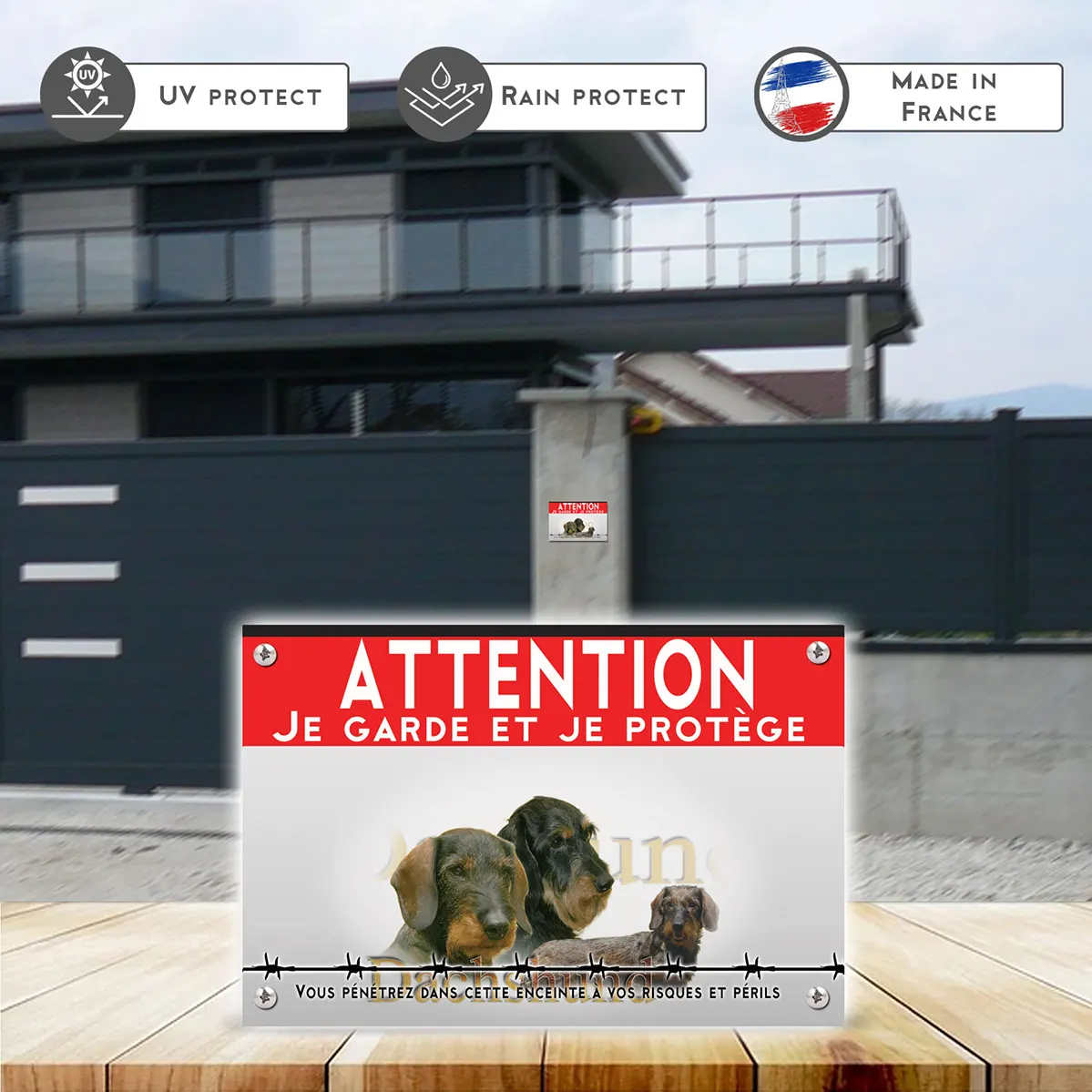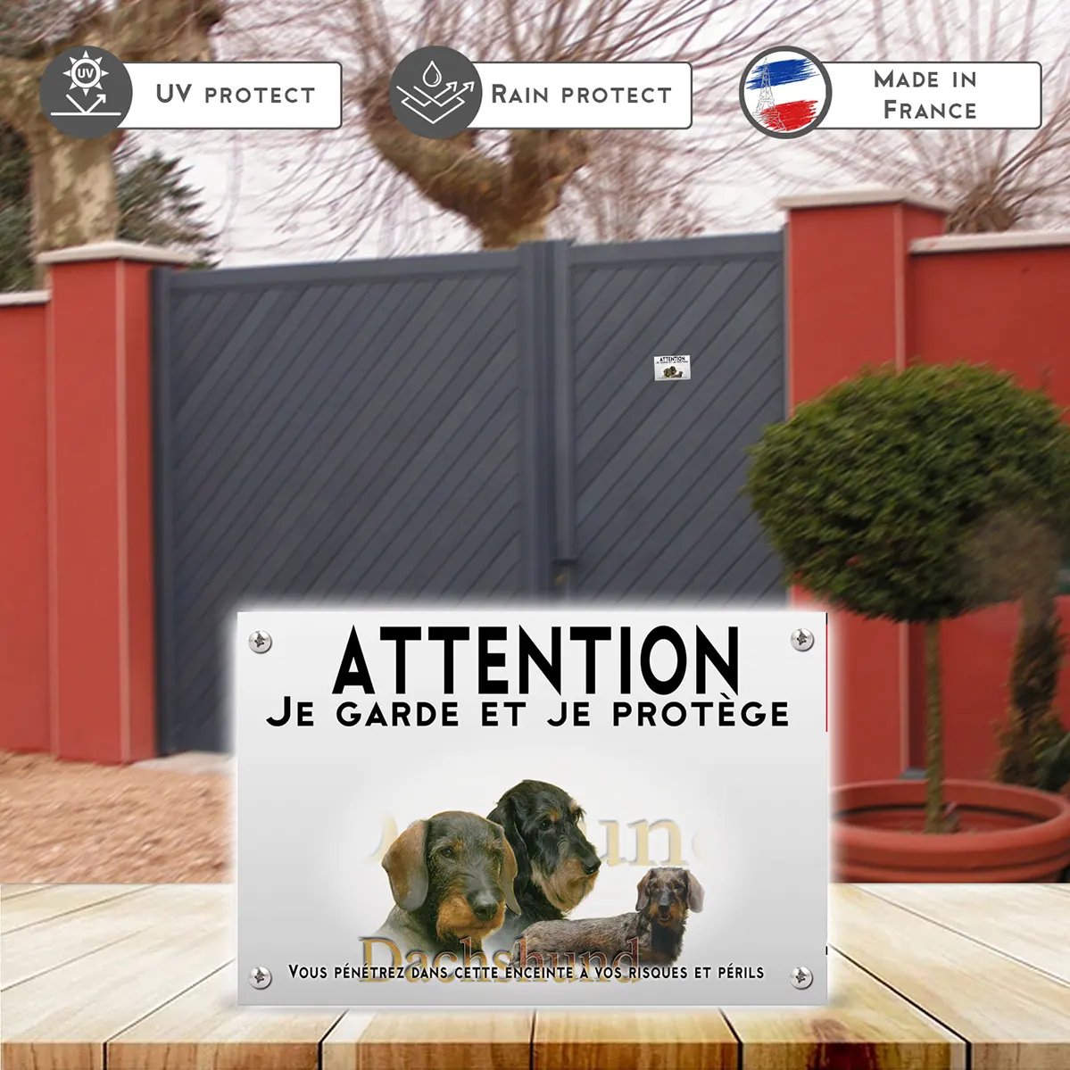 Pour assurer la sécurité de votre foyer tout en préservant l’affection que vous portez à votre teckel poil ras, ce panneau attention au chien teckel poil ras est un choix judicieux. En plus d’être un élément de dissuasion, cette plaque joue un rôle essentiel dans la signalisation responsable. Soyez serein : vos visiteurs seront avertis sans être intimidé.