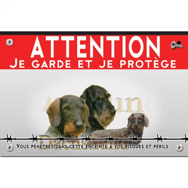 La plaque « Attention au chien » se distingue par une illustration captivante, positionnée au centre, où plusieurs portraits de teckels poil ras sont visibles. Le fond gris clair met en avant le texte rouge vif, tandis que les teckels, illustrés dans des teintes naturelles de brun et noir, affichent des expressions amicales et pétillantes. En bas, une ligne de barbelés apporte une dimension de sécurité, soulignant le message protecteur. Le lettrage doré du mot « teckel » ajoute une touche d’élégance, garantissant une grande lisibilité et une clarté du message “panneau attention au chien”.