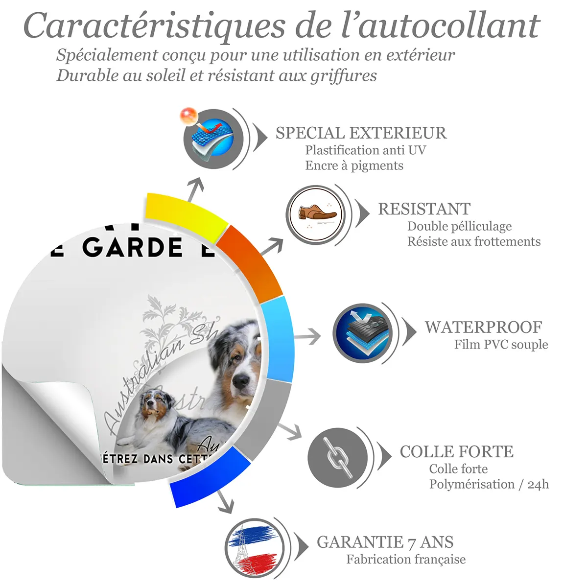 - Illustration réaliste du Berger Australien Bleu : une image fidèle qui authentifie la présence de votre compagnon et renforce l’effet de prévention.