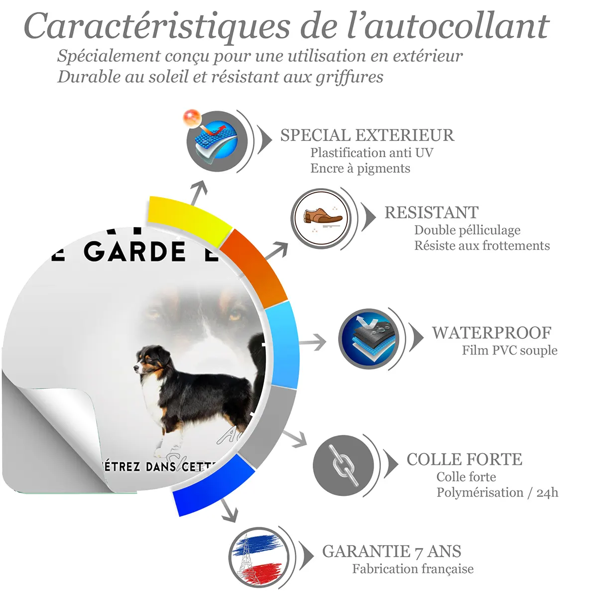 Affichez avec force et élégance la présence de votre Berger Australien Tricolor. Ce panneau Attention au Chien Berger Australien Tricolor de la Gamme Impact, disponible en métal Dibond et autocollant résistant aux intempéries et imprimé en UV, offre un contraste puissant pour une lisibilité immédiate et une dissuasion polie à l’entrée.