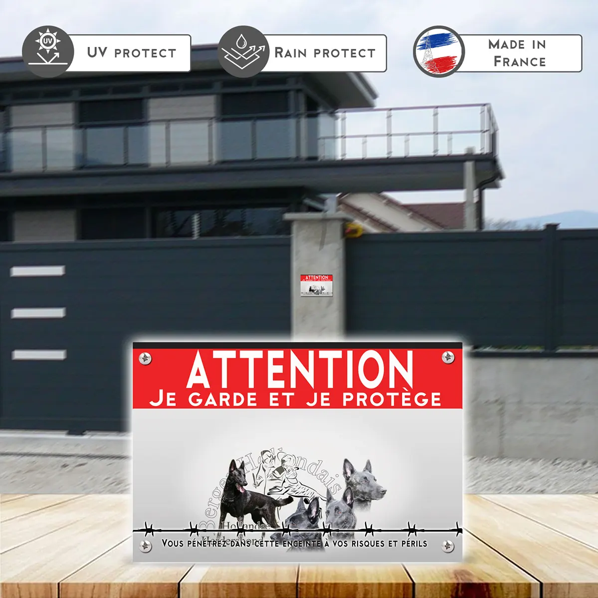 La plaque arbore un fond gris avec une inscription rouge frappante en haut qui dit « ATTENTION », accompagnée de « Je garde et je protège » en lettres blanches. Au centre, plusieurs illustrations de Bergers Hollandais poil court, aux pelages noirs et gris, affichent des postures dynamiques, suscitant une impression de vigilance et de force. Les couleurs contrastantes, le rouge et le noir, rendent le message avertisseur très impactant, tandis que le fond gris harmonise l’ensemble. La présence de barbelés au bas de la plaque ajoute une dimension supplémentaire de sécurité.