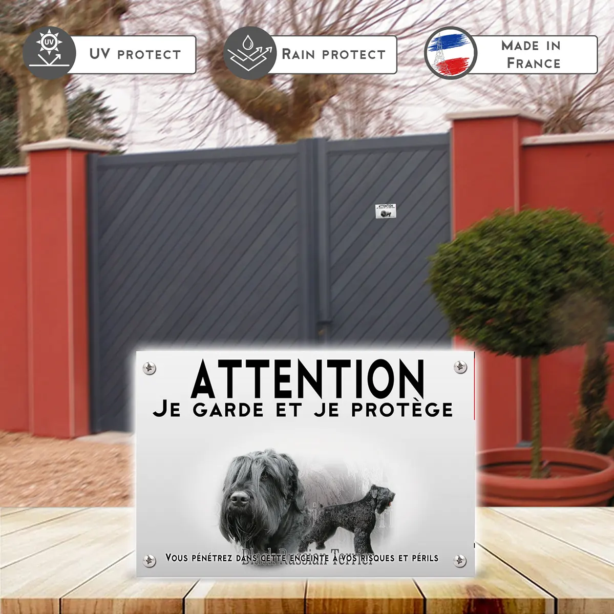 Bienvenue dans l’univers protecteur de nos fidèles amis à quatre pattes ! La sécurité de votre espace de vie est primordiale, et le panneau attention au chien terrier noir de russie joue un rôle crucial dans cette démarche. Ce panneau, au message clair et concis, informe tout visiteur de la présence d’un canidé de garde tout en mettant en avant le caractère dévoué de votre terrier noir de russie.