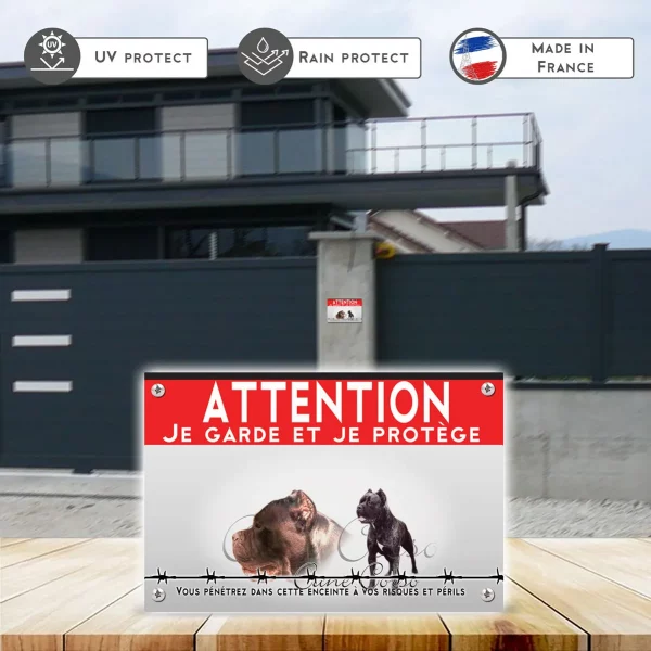 - Prévention essentielle : informe clairement de la présence du chien, limite les approches hasardeuses et aide à protéger vos biens et votre propriété.