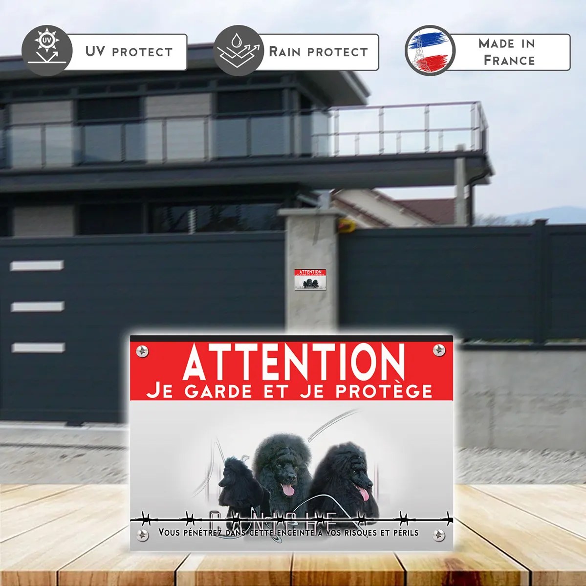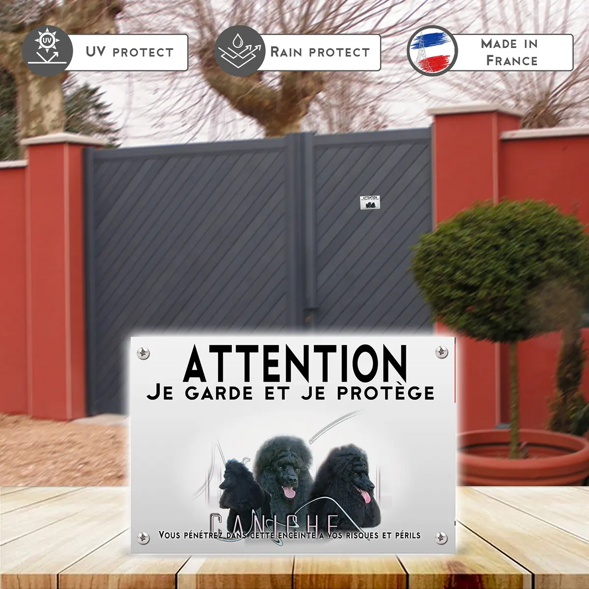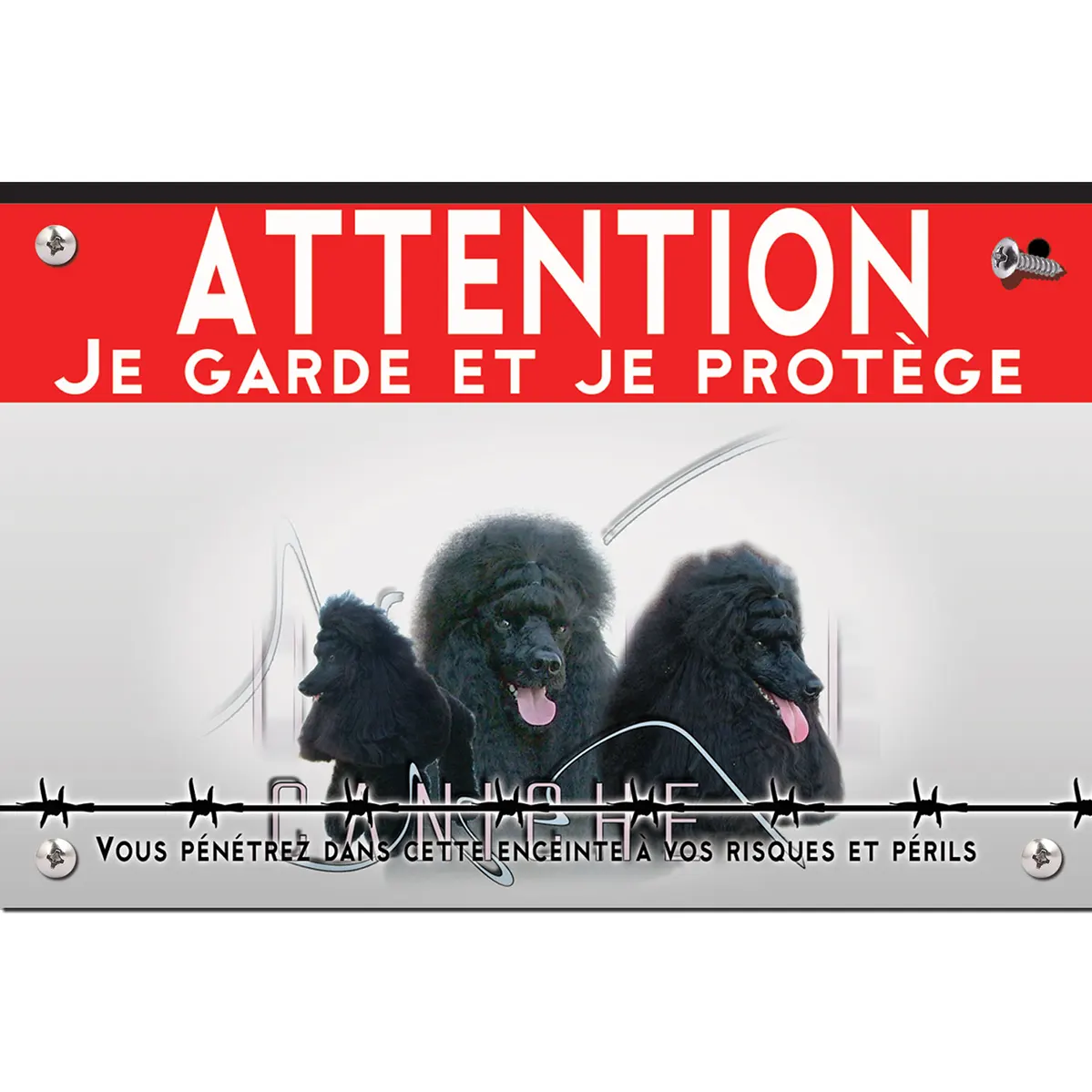 Pour en savoir plus sur notre gamme de plaque Attention au Chien Caniche Noir.