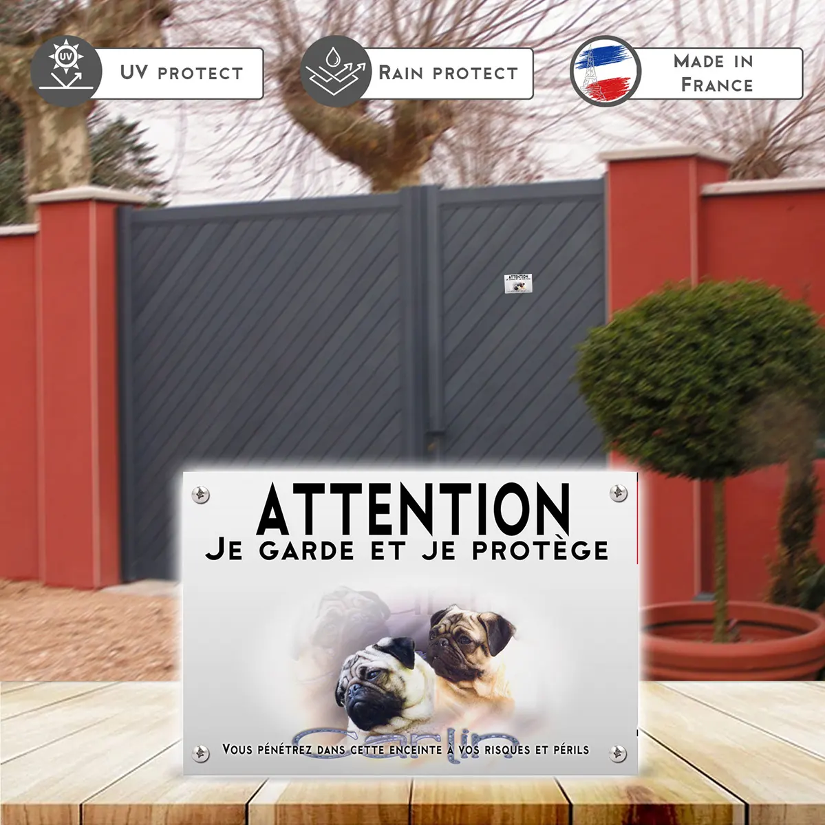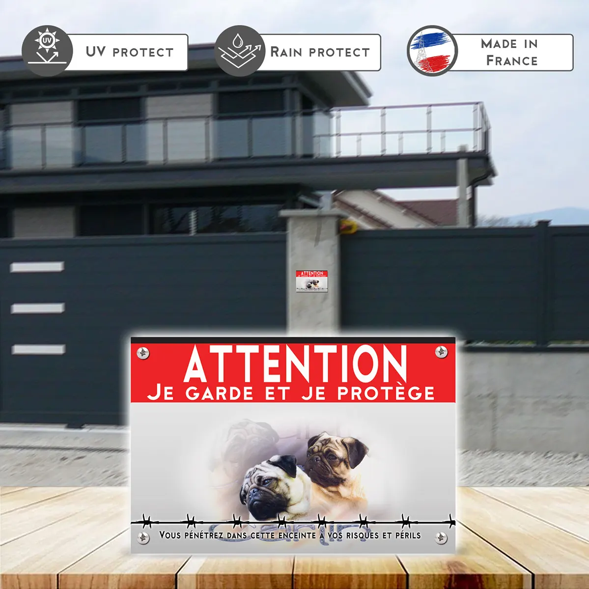 La plaque « Attention au chien » se distingue par son fond gris, avec en premier plan deux adorables Carlins, représentant les nuances beige et noir. L’encadré rouge en haut attire immédiatement l’attention, portant l’inscription « ATTENTION » en lettres blanches épaisses. En bas, la barre noire flanquée de barbelés souligne le message de sécurité, garantissant ainsi une meilleure lisibilité et clarté du message “panneau attention au chien”. Cette illustration conviviale, combinant sécurité et charme, saura séduire tous ceux qui souhaitent protéger leur domicile avec style.