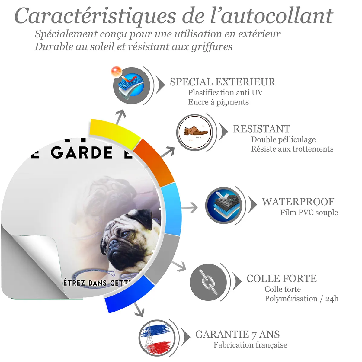 - Prévention essentielle : informe clairement de la présence du chien, limite les approches hasardeuses et aide à protéger vos biens et votre propriété.