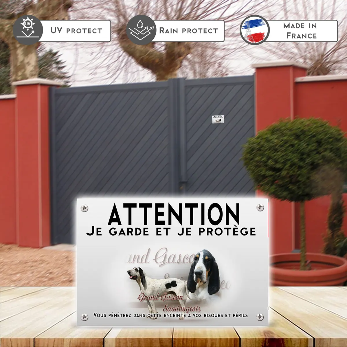 Pour en savoir plus sur notre gamme de plaque Attention au Chien Gascon Saintongeois.