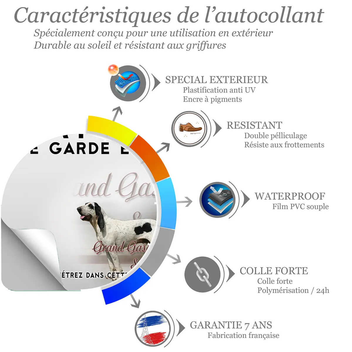 Affichez avec force et élégance la présence de votre Gascon Saintongeois. Ce panneau Attention au Chien Gascon Saintongeois de la Gamme Impact, disponible en métal Dibond et autocollant résistant aux intempéries et imprimé en UV, offre un contraste puissant pour une lisibilité immédiate et une dissuasion polie à l’entrée.