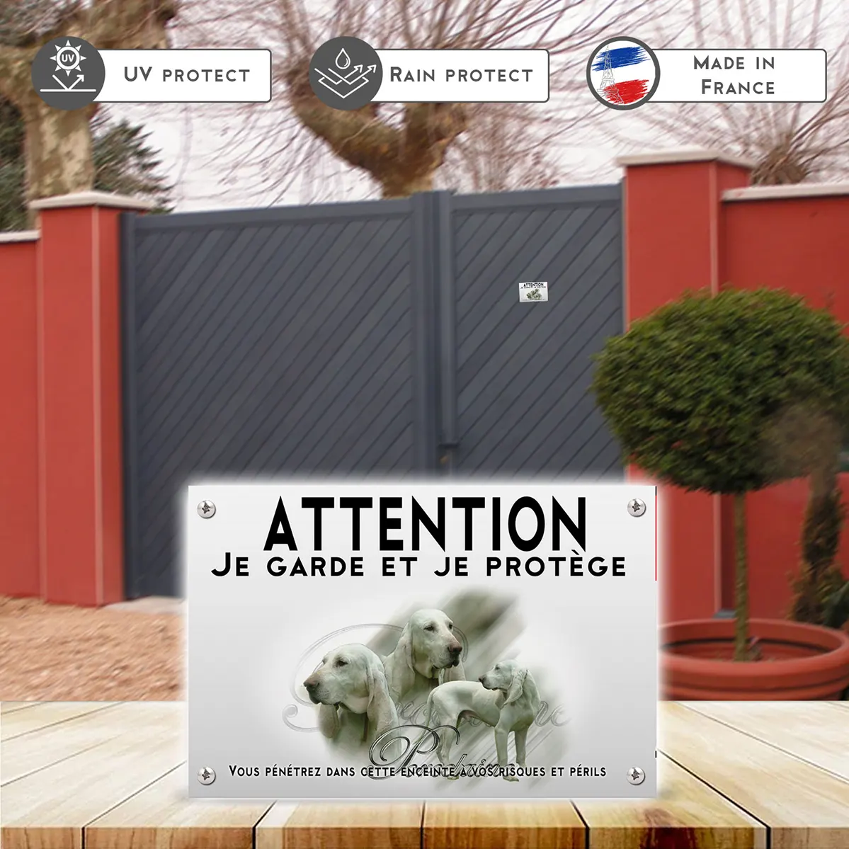 • Signal fort & dissuasion immédiate : le message “Attention au chien” est lisible en un coup d’œil, pensé pour prévenir avant d’intervenir.