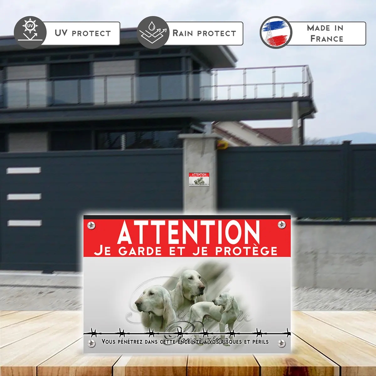Oui, la mention “Attention au chien” est claire et lisible. Le visuel du Pointer Anglais renforce l’effet dissuasif auprès des visiteurs ou des intrus.