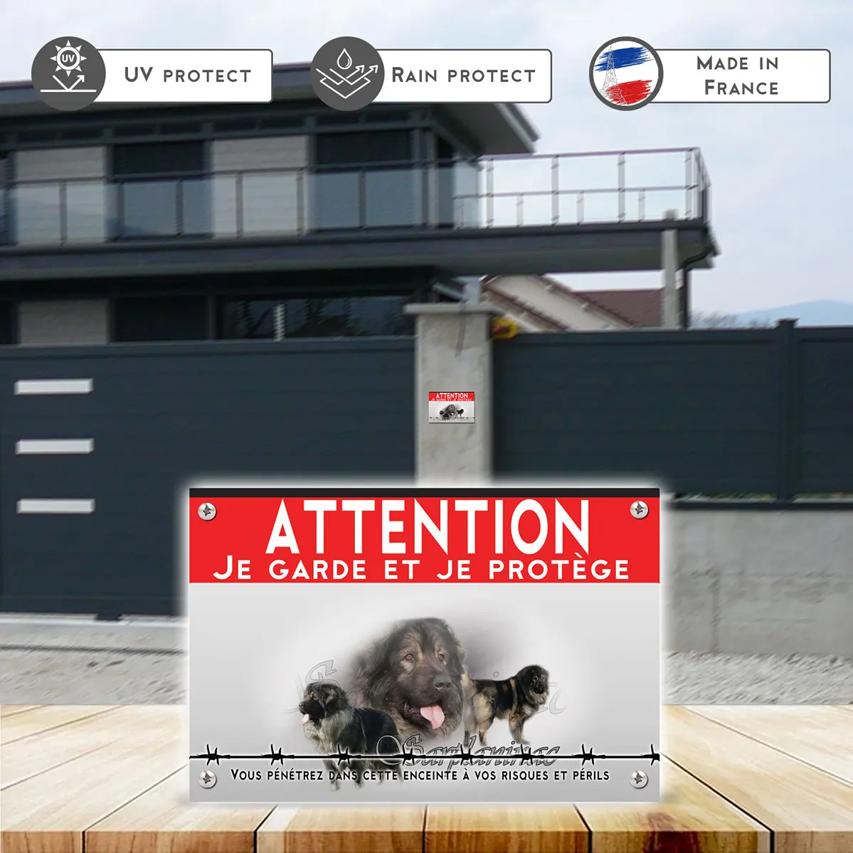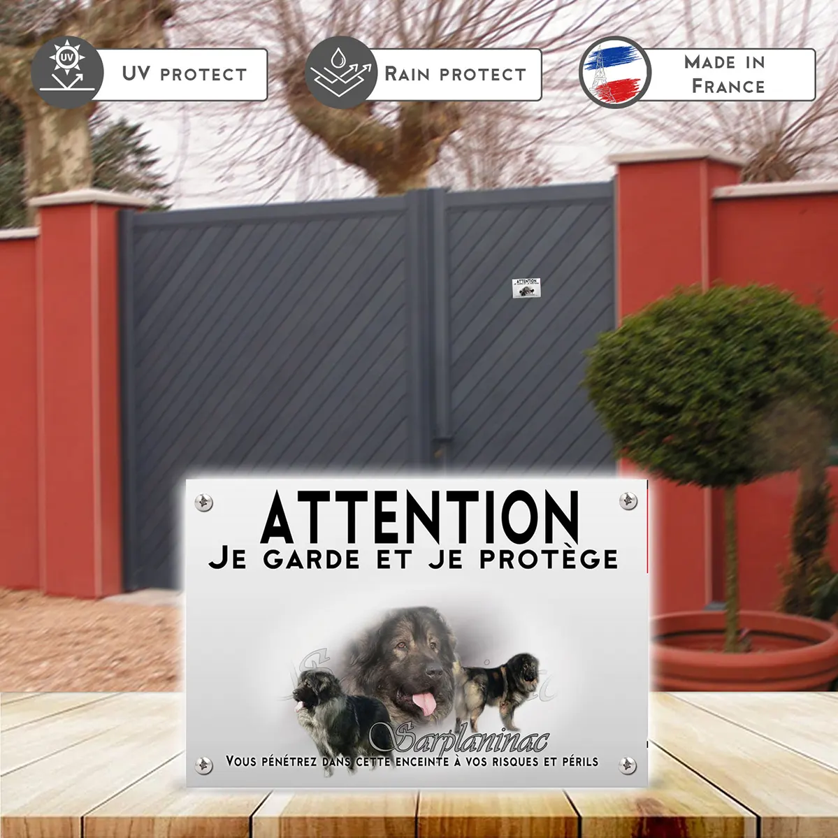 La plaque « Attention au chien » présente un collage de Chiens Sarplaninac : au centre, un Sarplaninac au pelage long et dense, typiquement noir et brun, affiche une expression amicale mais protectrice. À gauche, une illustration d’un chien en profil complète l’image, tandis qu’à droite, un autre Sarplaninac semble en pleine action, ce qui donne une impression de dynamisme. Le fond en dégradé clair met élégamment en valeur les chiens, tandis qu’une barre de barbelés en bas signale la zone potentiellement dangereuse. Le texte « ATTENTION JE GARDE ET JE PROTÈGE » écrit en lettres blanches capitales sur un fond rouge vif accentue l’urgence du message, assurant ainsi une lisibilité et une clarté du message.