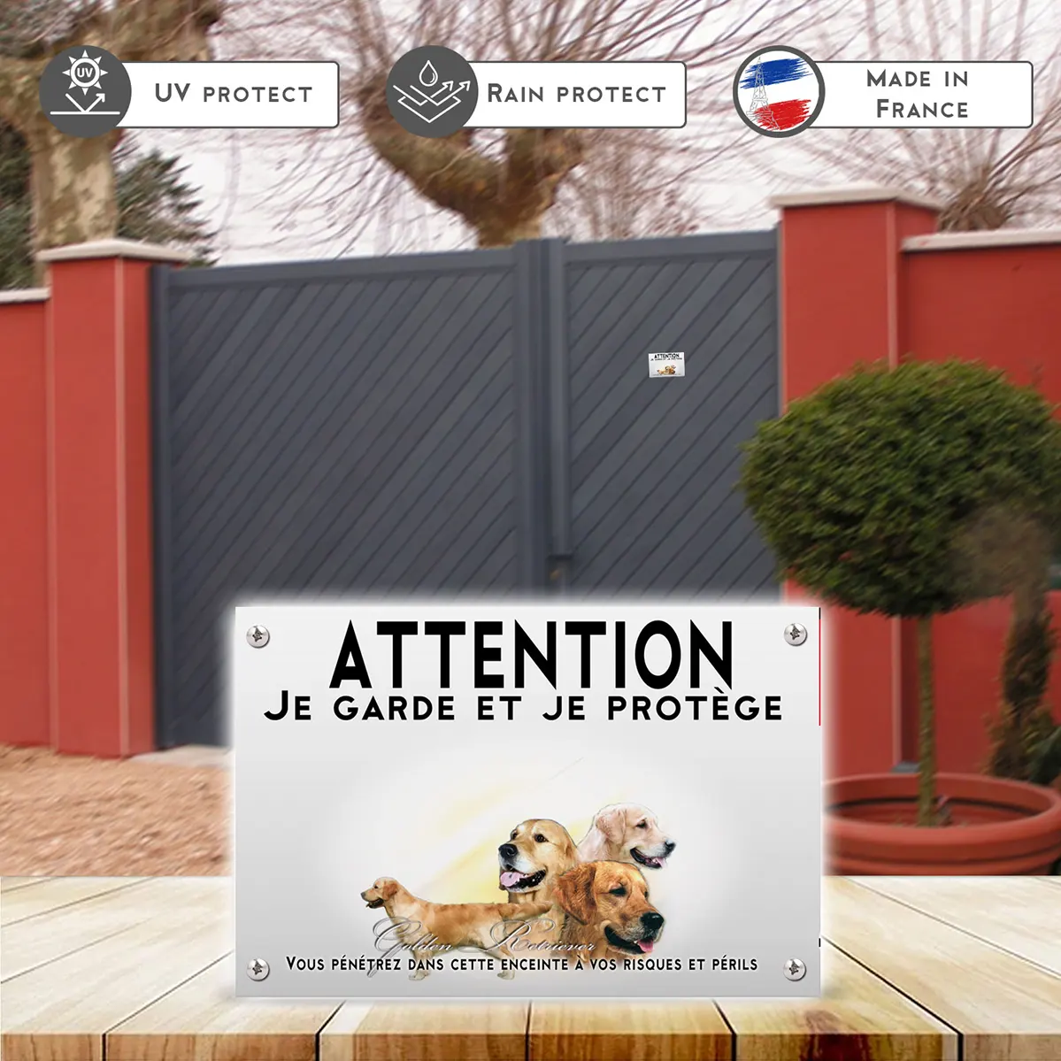 Pour en savoir plus sur notre gamme de plaque Attention au Chien Chien Golden.