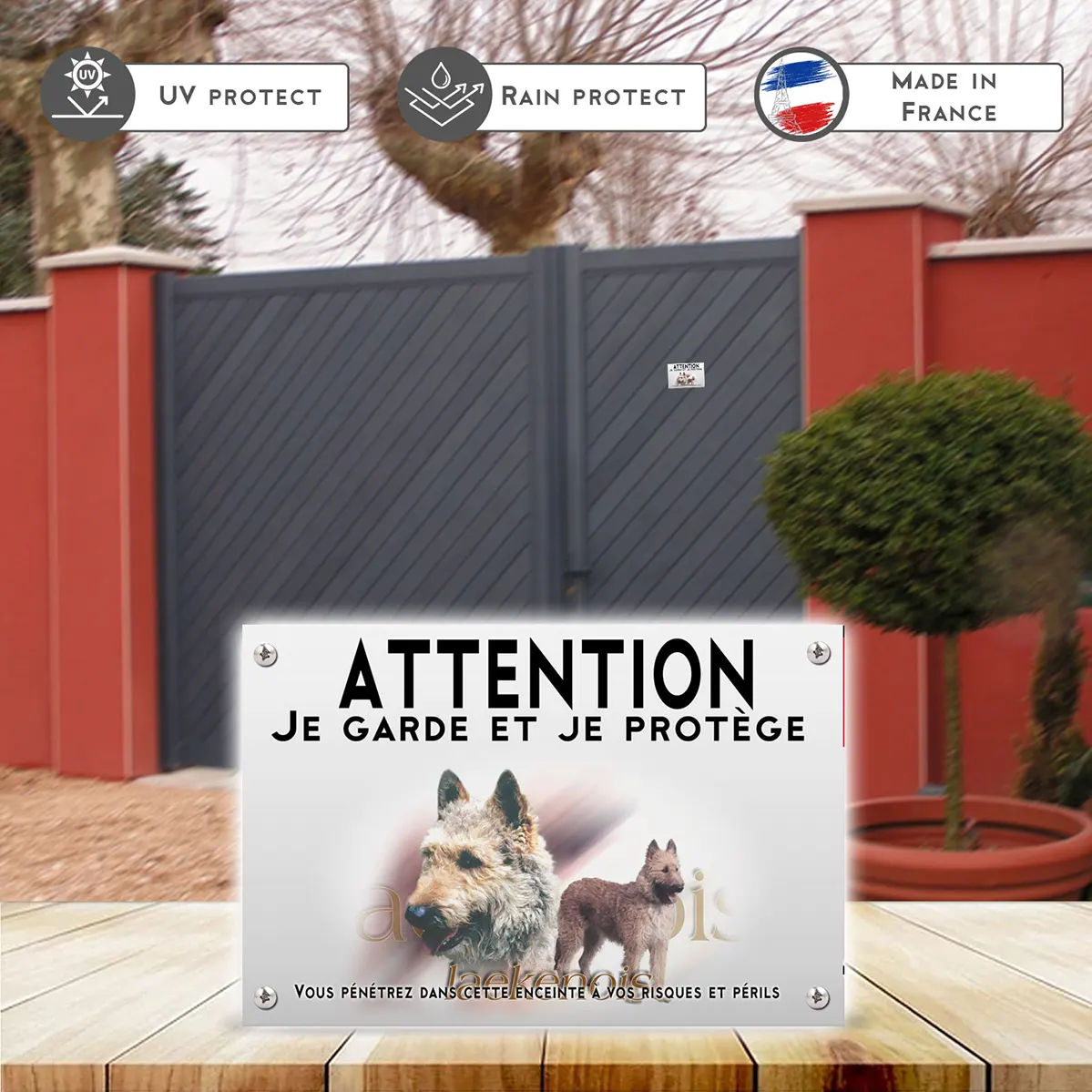 Affichez avec force et élégance la présence de votre Laekenois. Ce panneau Attention au Chien Laekenois de la Gamme Impact, disponible en métal Dibond et autocollant résistant aux intempéries et imprimé en UV, offre un contraste puissant pour une lisibilité immédiate et une dissuasion polie à l’entrée.