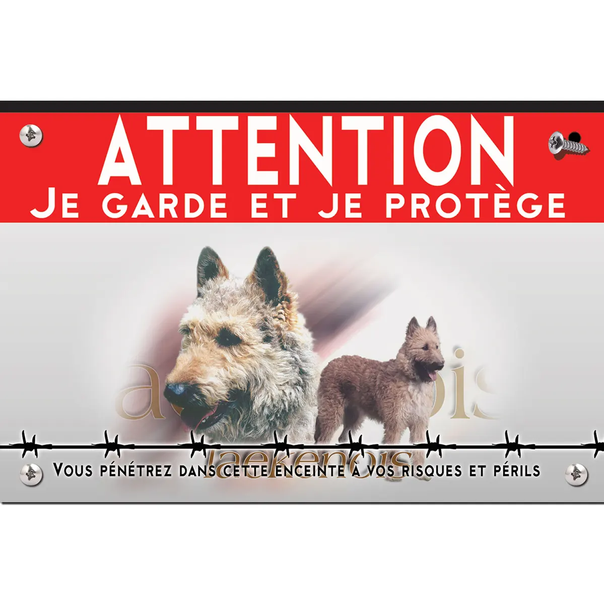 Le style général de la plaque se veut accueillant tout en affirmant un message de sécurité. Le texte « ATTENTION » est en rouge vif, attirant l’attention immédiatement, tandis que la phrase « Je garde et je protège » renforce ce sentiment de vigilance. Avec un fond gris clair, le contraste reste subtil mais efficace. Deux magnifiques Laekenois sont représentés : à gauche, un chien âgé à la fourrure grise qui évoque sagesse et protection, et à droite, un Laekenois plus jeune avec un pelage fauve clair, ajoutant douceur et énergie. Ce visuel illustre de façon éclatante l’esprit de la race, assurant la lisibilité et la clarté du message “panneau attention au chien”.