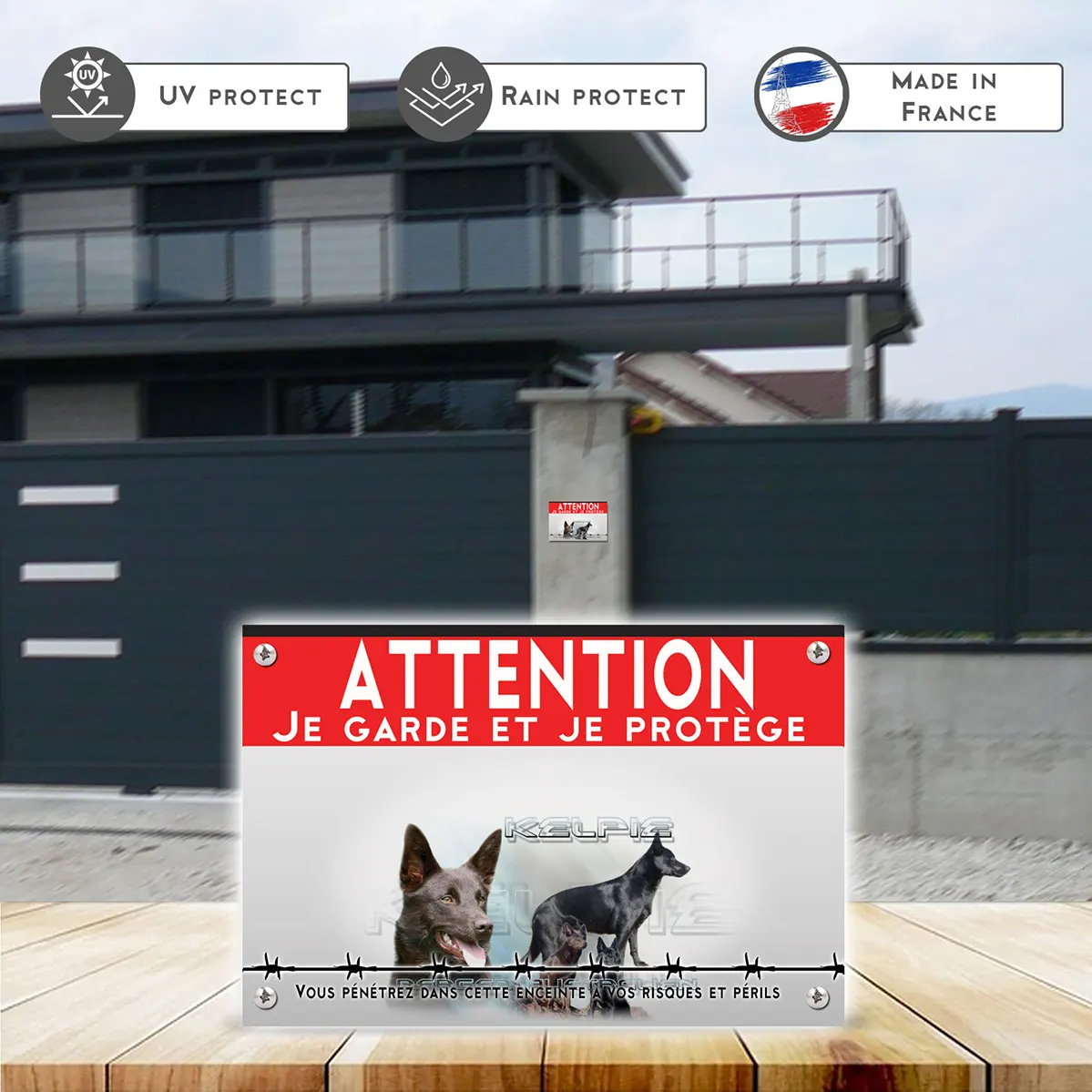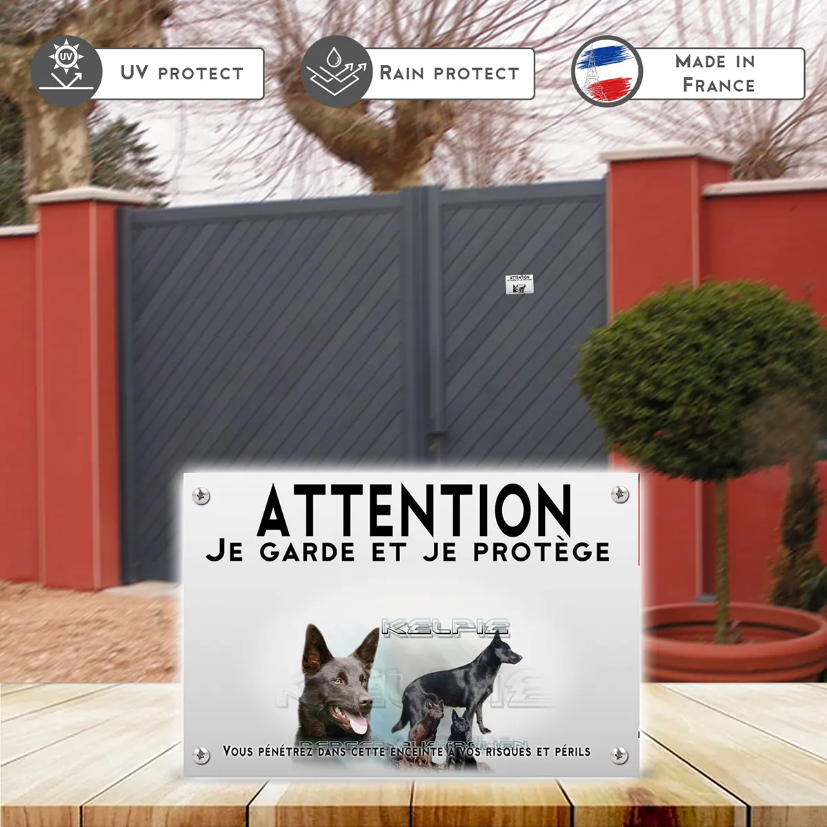 Affichez avec force et élégance la présence de votre Chien Kelpie. Ce panneau Attention au Chien Chien Kelpie de la Gamme Impact, disponible en métal Dibond et autocollant résistant aux intempéries et imprimé en UV, offre un contraste puissant pour une lisibilité immédiate et une dissuasion polie à l’entrée.