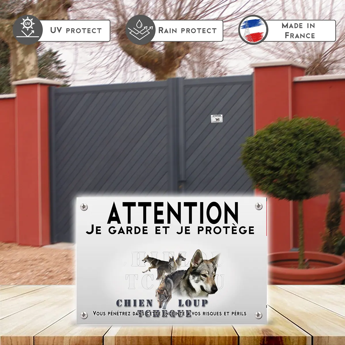 Le chien-loup, d’origine tchèquie, est connu pour son instinct de garde inné. Sa vigilance naturelle en fait un formidable protecteur pour votre foyer. En tant que gardien de vos biens et de votre propriété, il sait faire preuve d’une attention constante, tout en étant un compagnon affectueux pour sa famille. Il bénéficie d’un équilibre fascinant entre un instinct de garde très développé et une doucœur familiale qui en fait un incroyable allié, à la fois protecteur et tendre. Une signalisation adaptée, comme notre panneau attention au chien chien-loup, valorise son rôle de dissuasion douce et respectueuse.