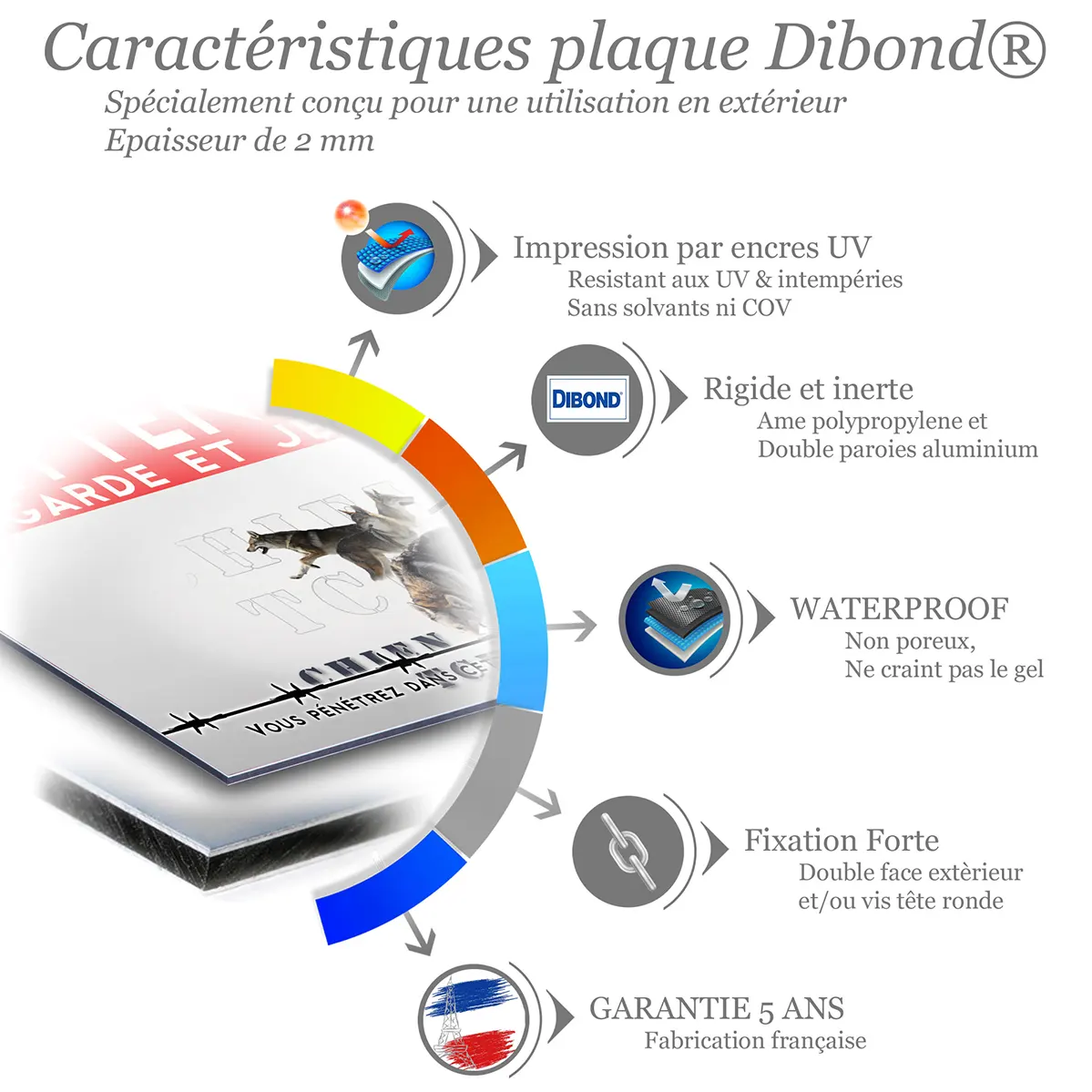 Affichez avec force et élégance la présence de votre Chien-Loup. Ce panneau Attention au Chien Chien-Loup de la Gamme Impact, disponible en métal Dibond et autocollant résistant aux intempéries et imprimé en UV, offre un contraste puissant pour une lisibilité immédiate et une dissuasion polie à l’entrée.
