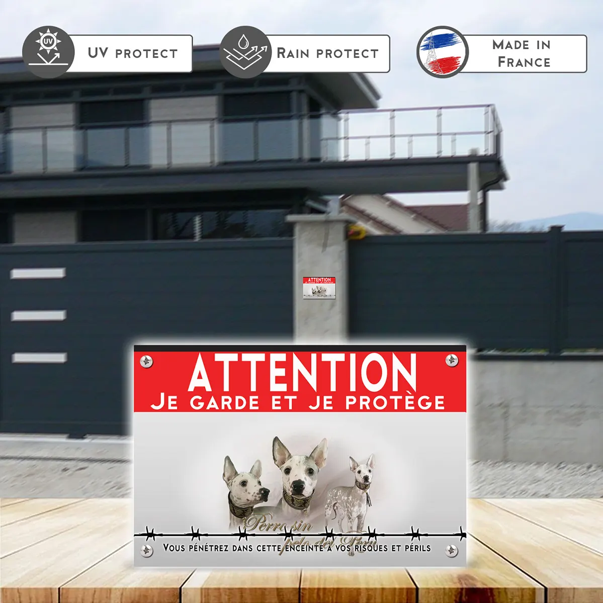 - Message direct “panneau attention au chien” : lisible et dissuasif sans agressivité.