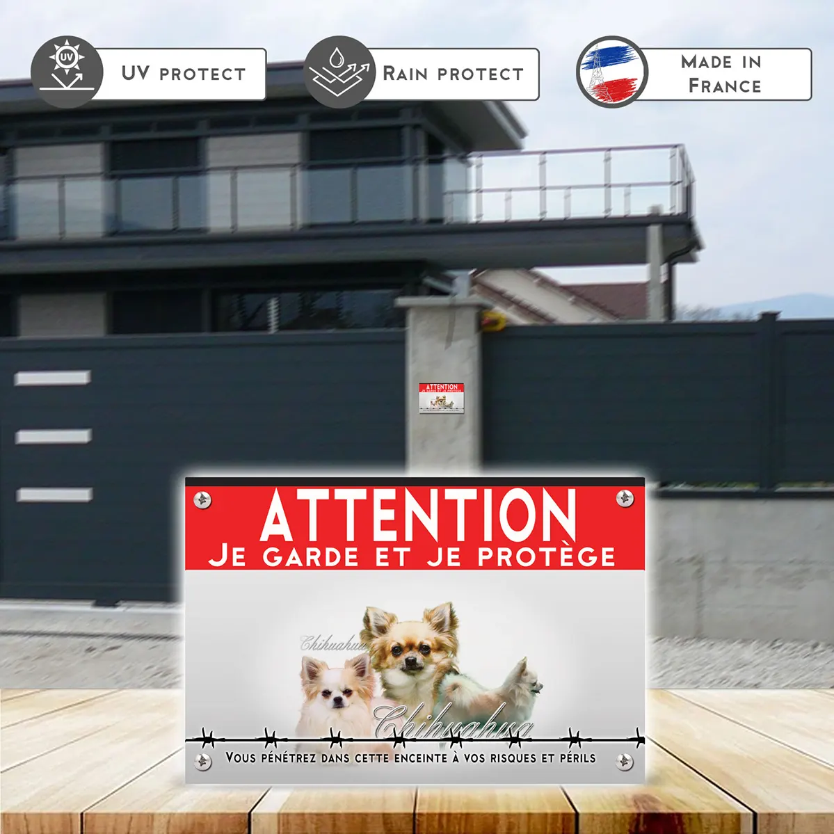 Au cœur du visuel de cette plaque, vous découvrirez deux chihuahuas à poil long, le premier avec un pelage crème et des oreilles alertes, et le deuxième, légèrement tourné, arbore un pelage doré, affichant une expression protectrice. Le fond gris pâle permet de mettre en valeur ces adorables compagnons. Le mot « ATTENTION » se détache en lettres blanches sur un fond rouge vif, tandis que le message « Je garde et je protège » rappelle efficacement la nature protectrice du chihuahua. Ce design combine à la fois lisibilité et clarté, renforçant le message de sécurité et de protection.