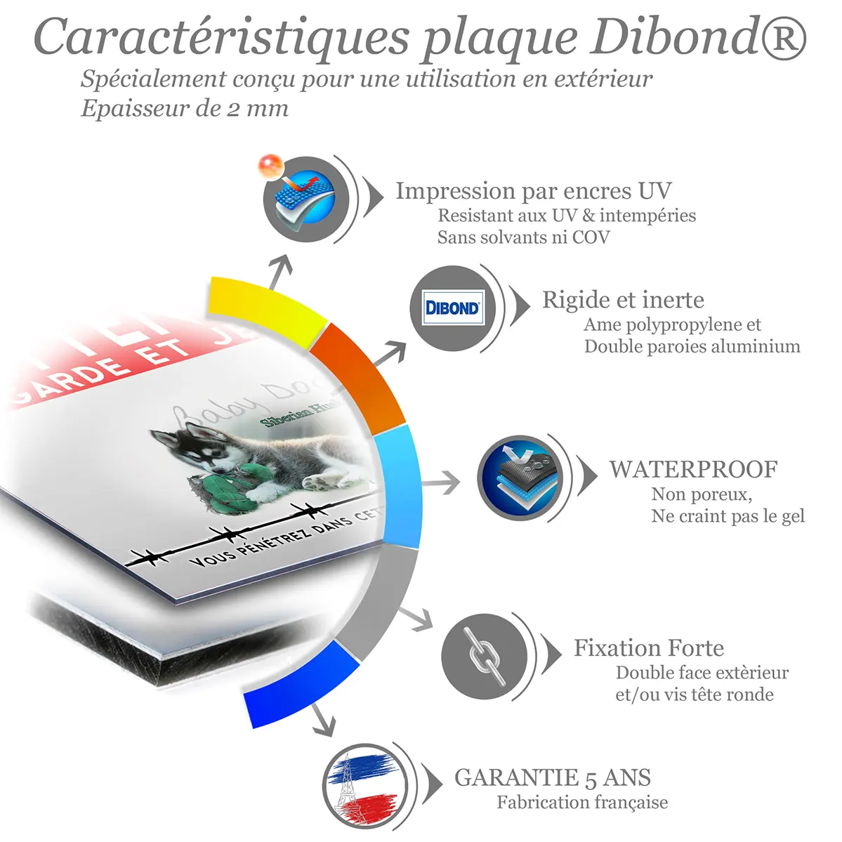 Affichez avec force et élégance la présence de votre Chiot Husky. Ce panneau Attention au Chien Chiot Husky de la Gamme Impact, disponible en métal Dibond et autocollant résistant aux intempéries et imprimé en UV, offre un contraste puissant pour une lisibilité immédiate et une dissuasion polie à l’entrée.