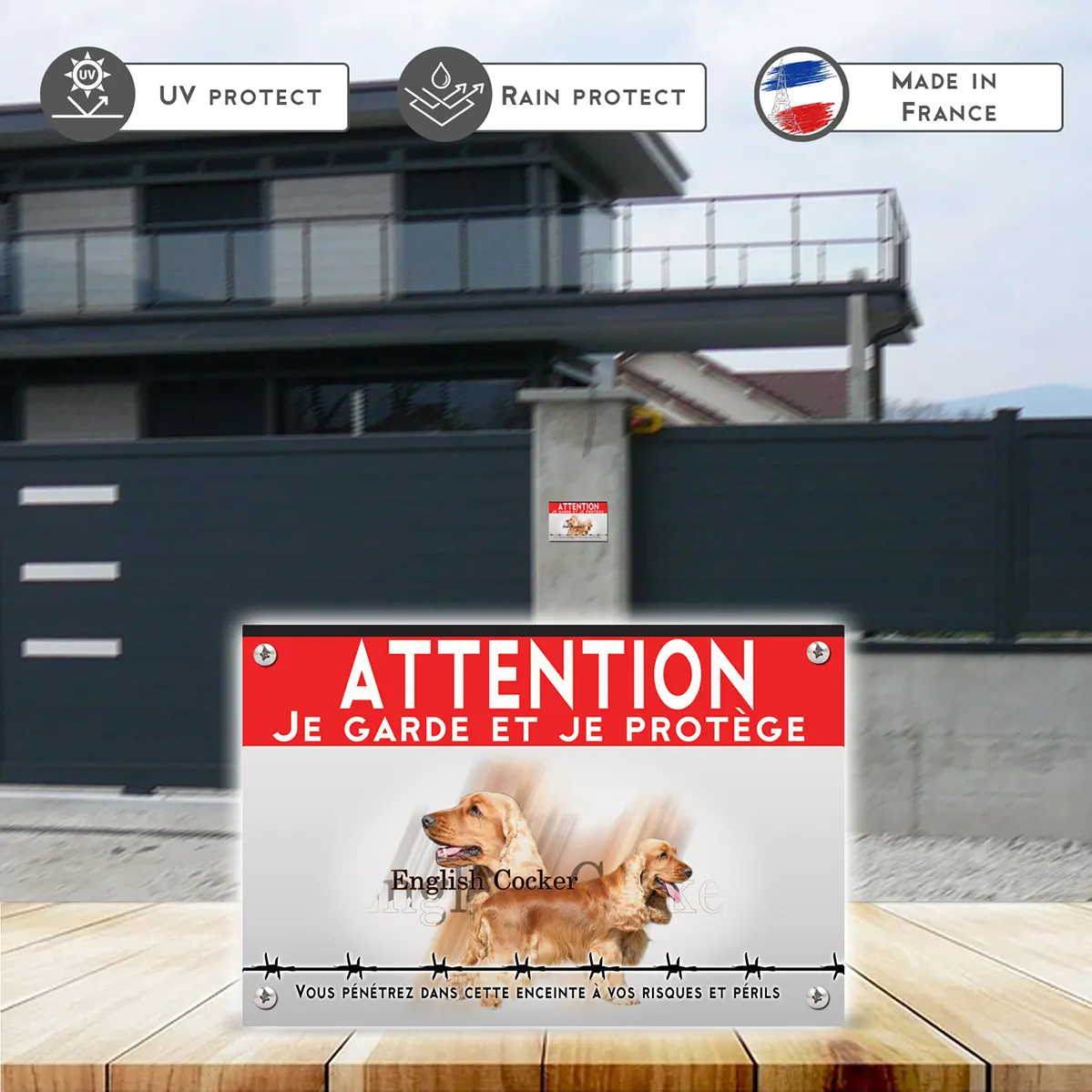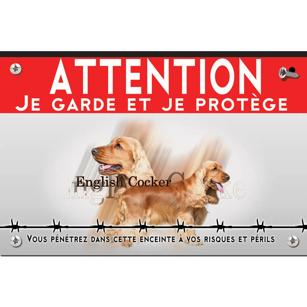 La plaque “Attention au chien” se distingue par son illustration vibrante de cocker anglais fauves au pelage doré et soyeux, évoquant leur amabilité. Le fond rouge vif attire immédiatement l’œil, tandis que le contraste avec les chiens ajoute une touche de chaleur à l’avertissement. Le mot « ATTENTION » en lettres capitales blanches est stratégiquement placé pour assurer une parfaite lisibilité du message. Une ligne de barbelés en bas apporte une dimension sérieuse à l’avertissement, tout en gardant une approche amicale.