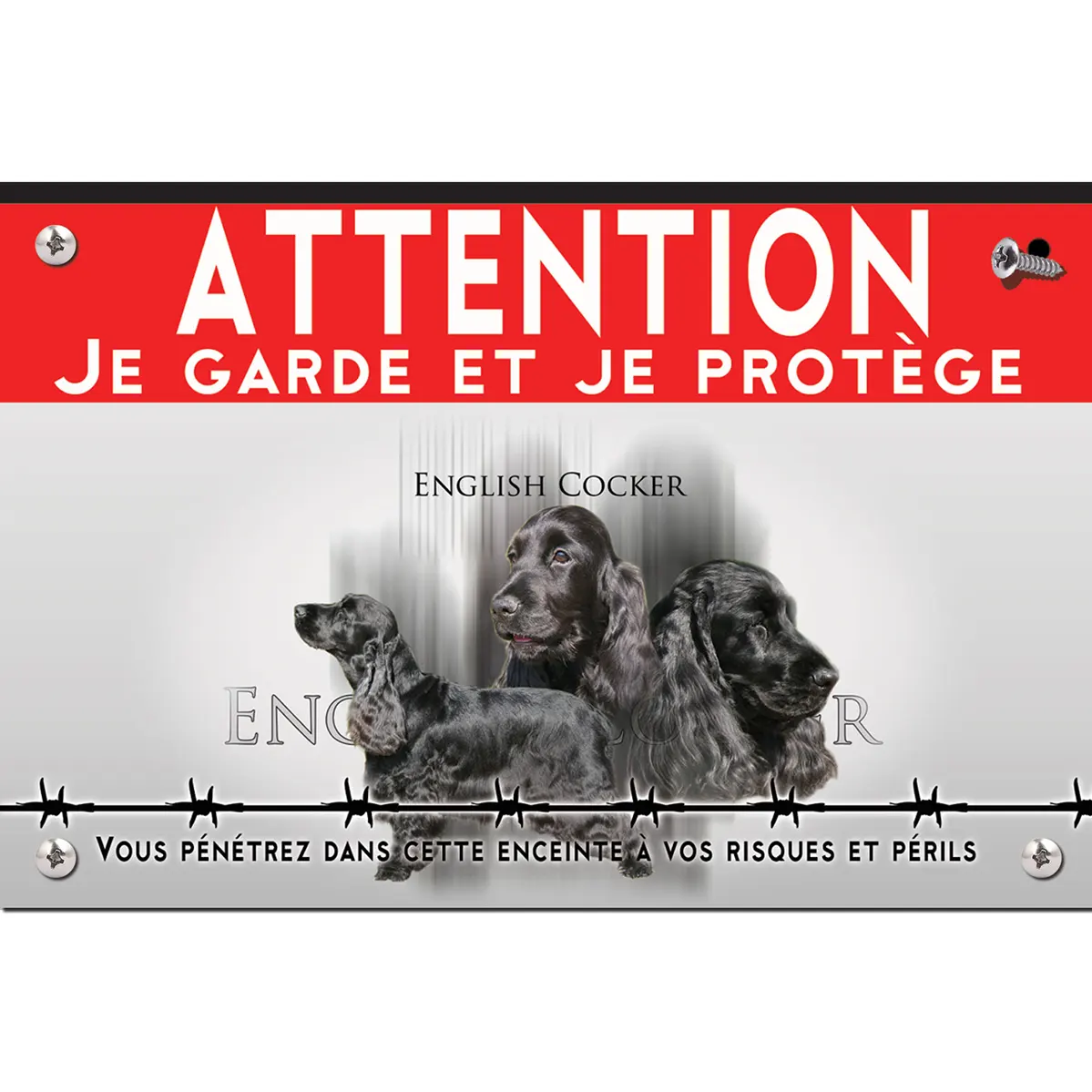 La plaque présente une illustration élégante d’un cocker anglais noir, sur fond argenté qui fait parfaitement ressortir leurs magnifiques reflets. Les chiens, illustrés avec soin, sont placés dans des poses variées, mettant en avant leur belle fourrure ondulée et leurs traits typiques. Le texte “English Cocker” au-dessus d’eux solidifie l’identité de la race, tout en garantissant une lisibilité et une clarté du message “panneau attention au chien”. Cette disposition attire non seulement l’attention mais dégage aussi un sentiment de sécurité.