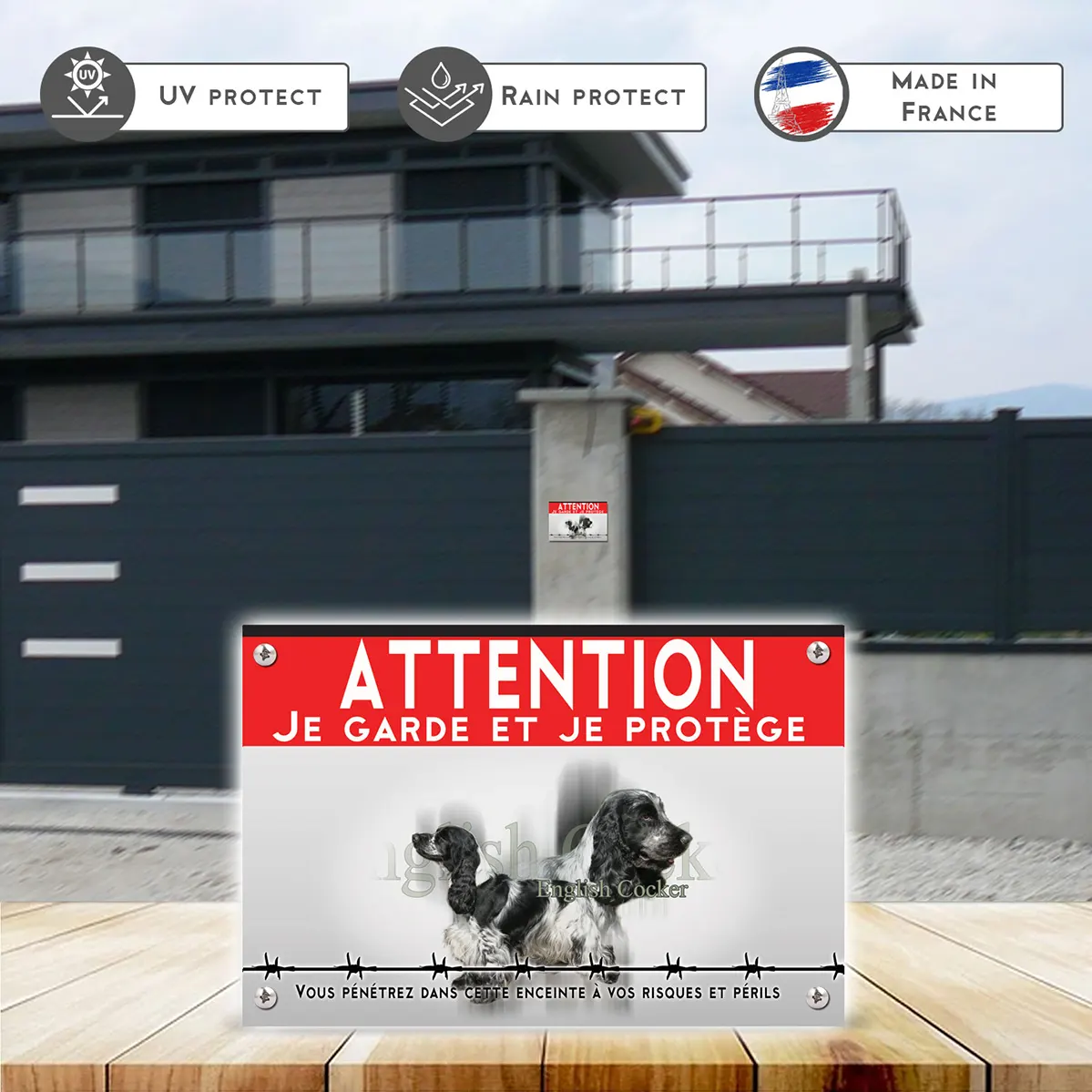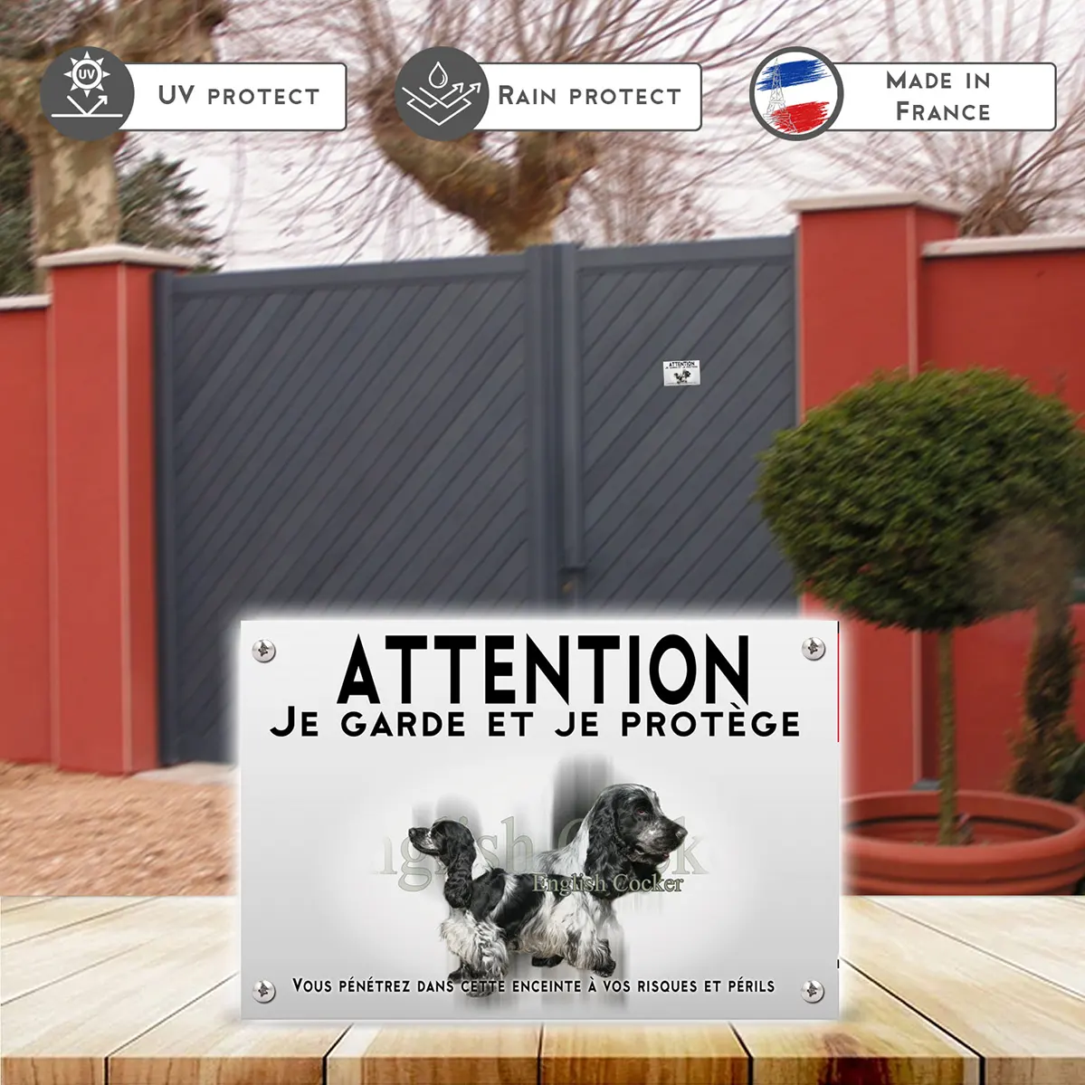 Pour en savoir plus sur notre gamme de plaque Attention au Chien Cocker Anglais Bicolore.