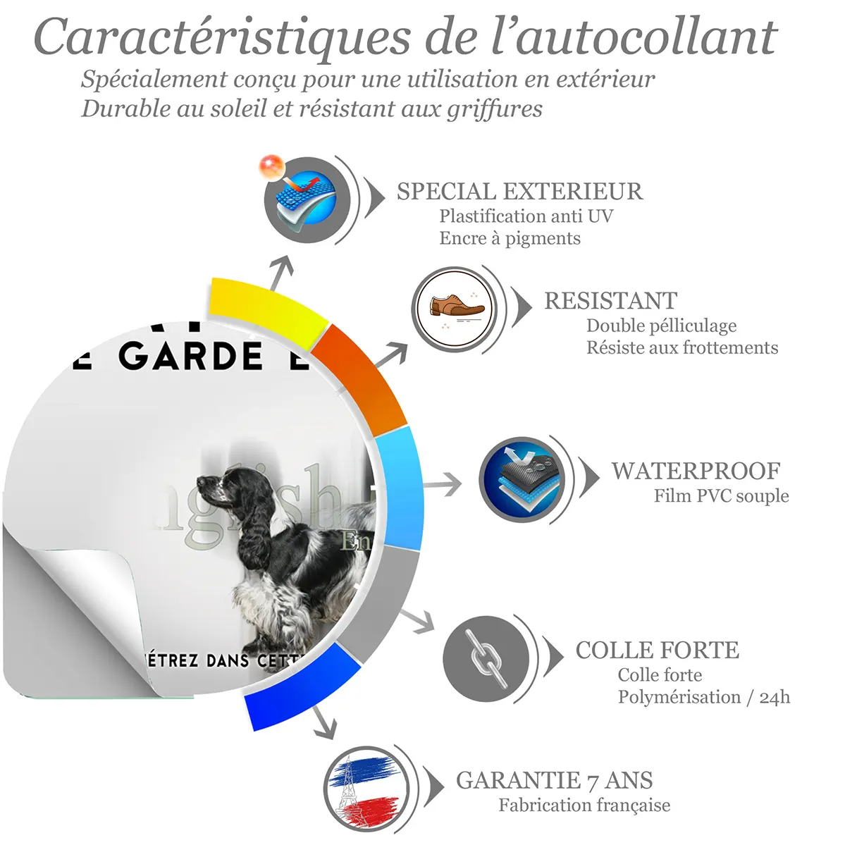 Affichez avec force et élégance la présence de votre Cocker Anglais Bicolore. Ce panneau Attention au Chien Cocker Anglais Bicolore de la Gamme Impact, disponible en métal Dibond et autocollant résistant aux intempéries et imprimé en UV, offre un contraste puissant pour une lisibilité immédiate et une dissuasion polie à l’entrée.