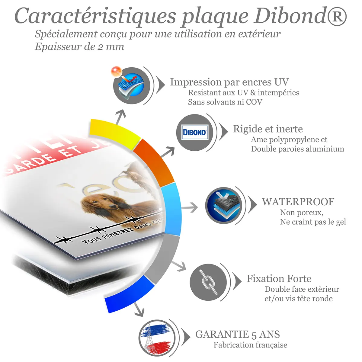Affichez avec force et élégance la présence de votre Dachshund. Ce panneau Attention au Chien Dachshund de la Gamme Impact, disponible en métal Dibond et autocollant résistant aux intempéries et imprimé en UV, offre un contraste puissant pour une lisibilité immédiate et une dissuasion polie à l’entrée.