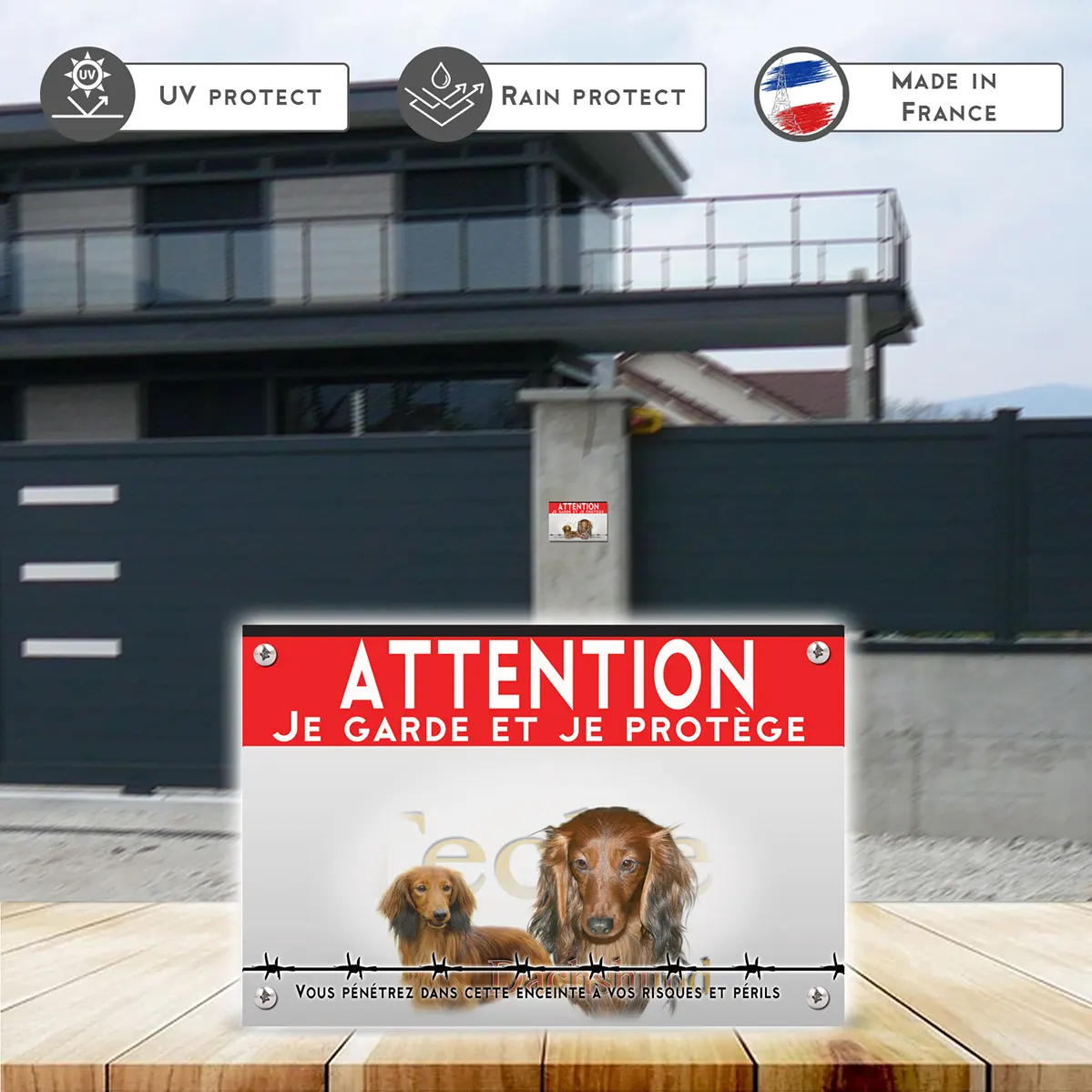 - Message direct “panneau attention au chien” : lisible et dissuasif sans agressivité.