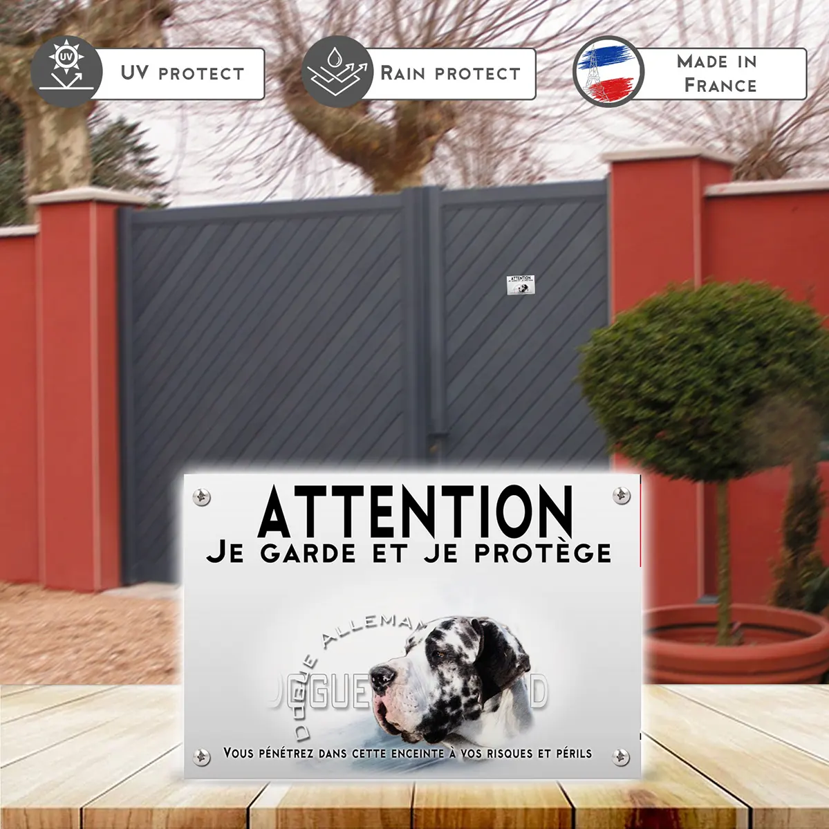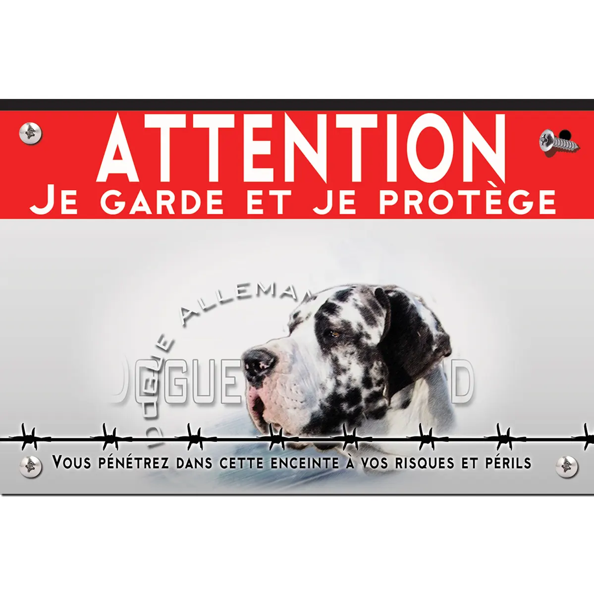 Pour en savoir plus sur notre gamme de plaque Attention au Chien Dogue Allemand Arlequin.