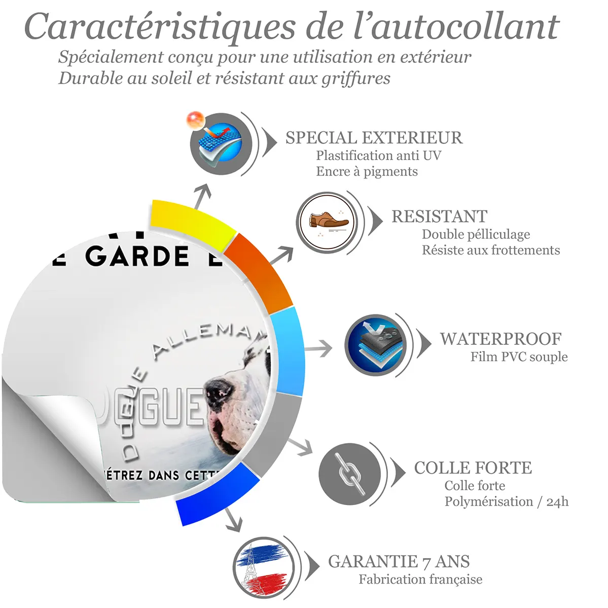 - Prévention essentielle : informe clairement de la présence du chien, limite les approches hasardeuses et aide à protéger vos biens et votre propriété.