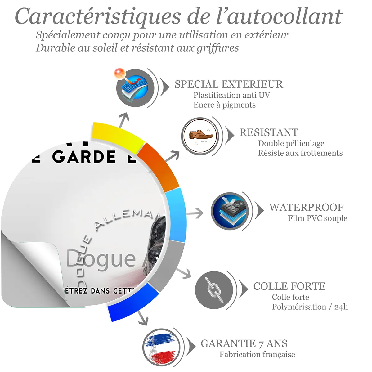 - Prévention essentielle : informe clairement de la présence du chien, limite les approches hasardeuses et aide à protéger vos biens et votre propriété.