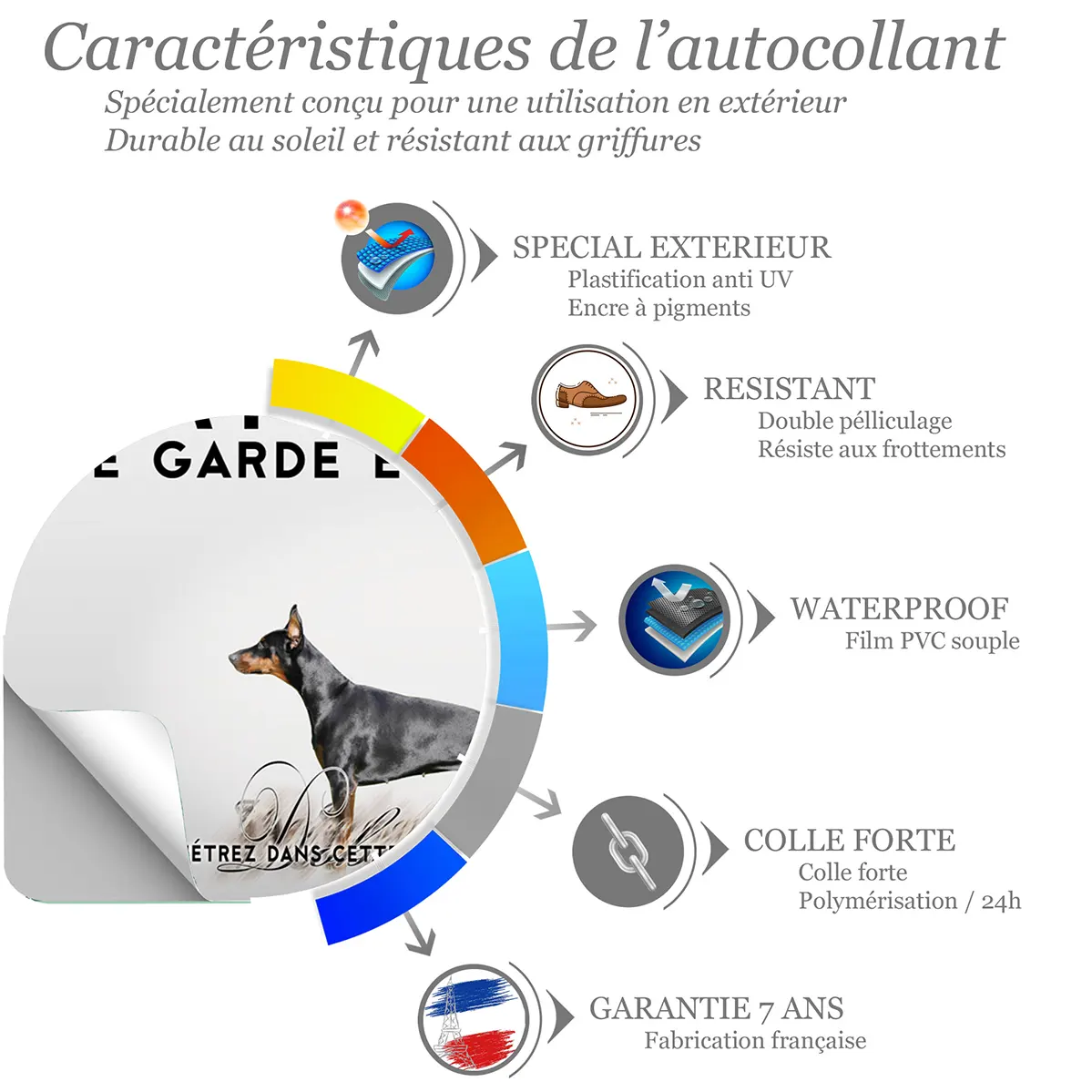 - Prévention essentielle : informe clairement de la présence du chien, limite les approches hasardeuses et aide à protéger vos biens et votre propriété.
