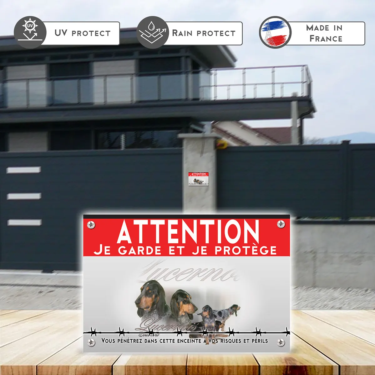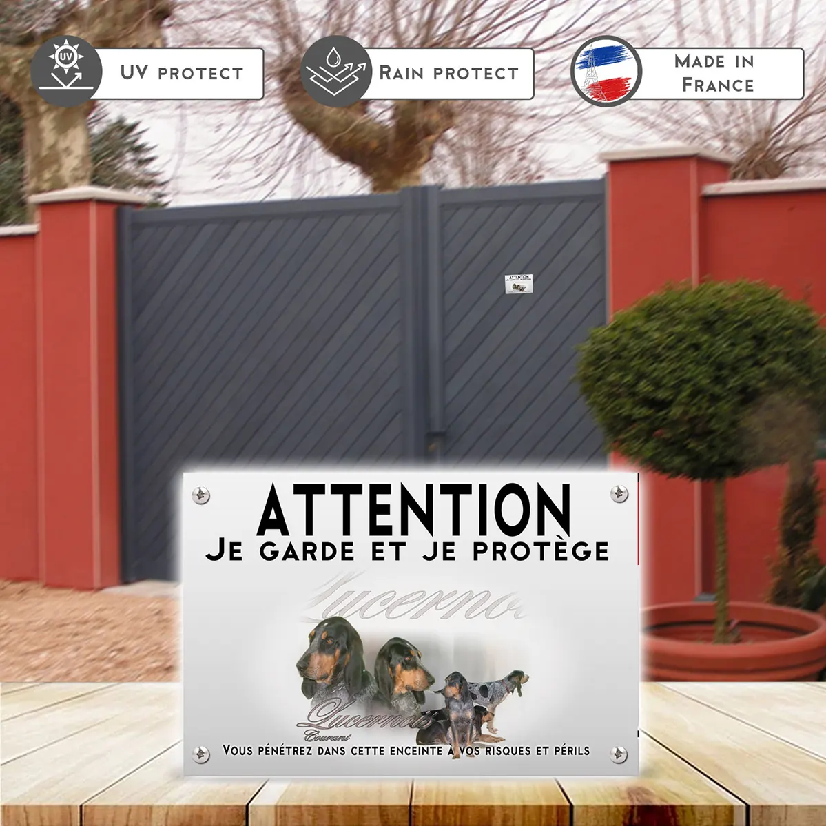 - Message direct “panneau attention au chien” : lisible et dissuasif sans agressivité.