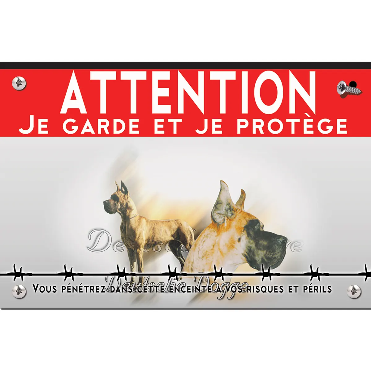 La plaque « Attention au chien » affiche un fond dégradé dans des tons neutres, favorisant à la fois une ambiance sérieuse et chaleureuse. Le mot « ATTENTION » est en rouge vif, garantissant une visibilité maximale, tandis que la phrase « Je garde et je protège » souligne le dévouement du grand danois. Deux représentations de ces chiens nobles, l’un de profil et l’autre légèrement tourné, sont mise en avant dans de délicats tons crème et marron, ce qui accentue leur élégance et leur rôle protecteur. En bas, une ligne de barbelés stylisée conclut le visuel, créant une projection de sécurité et de confiance.