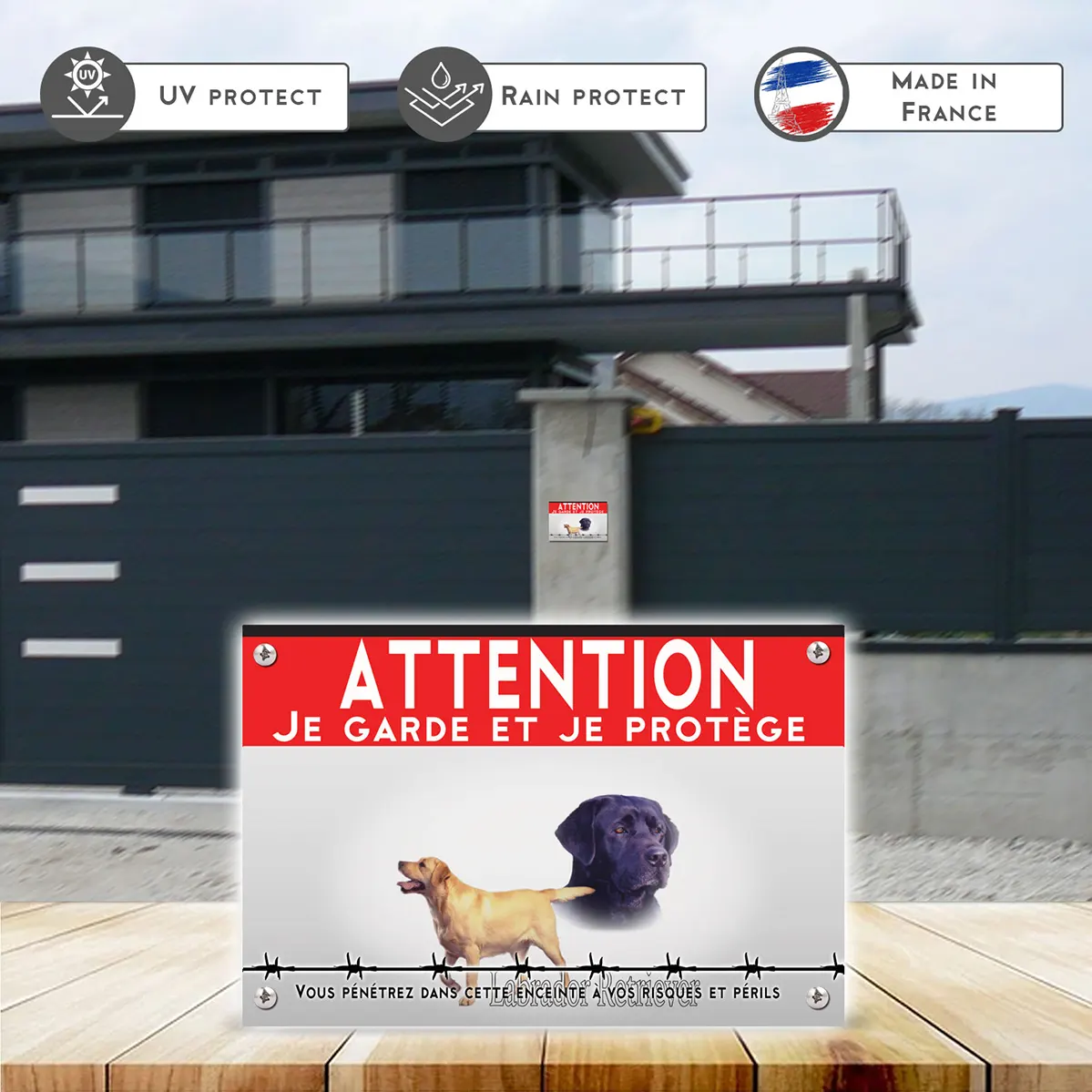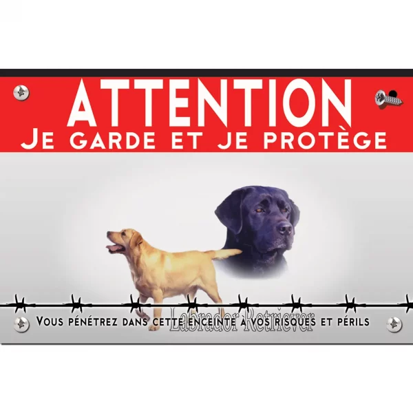 La plaque « Attention au chien » présente une illustration des charmants Labradors, avec un Labrador beige en mouvement, un noir plus sérieux au premier plan et un chocolat en arrière-plan. Les chiens, placés devant une barrière de barbelés, inspirent à la fois sécurité et vigilance. Le fond clair de la plaque fait ressortir le texte en rouge et noir, assurant lisibilité et clarté du message “panneau attention au chien”.