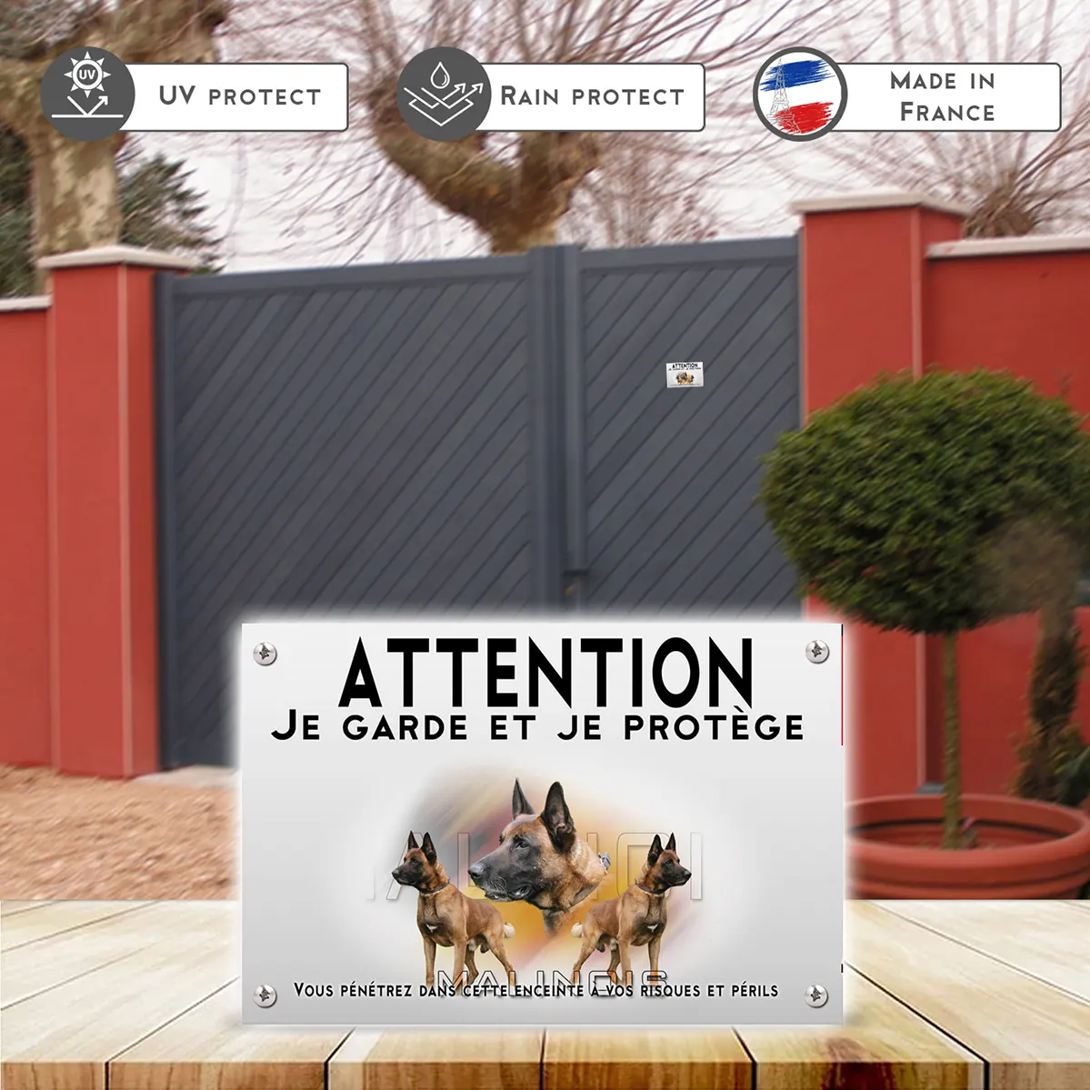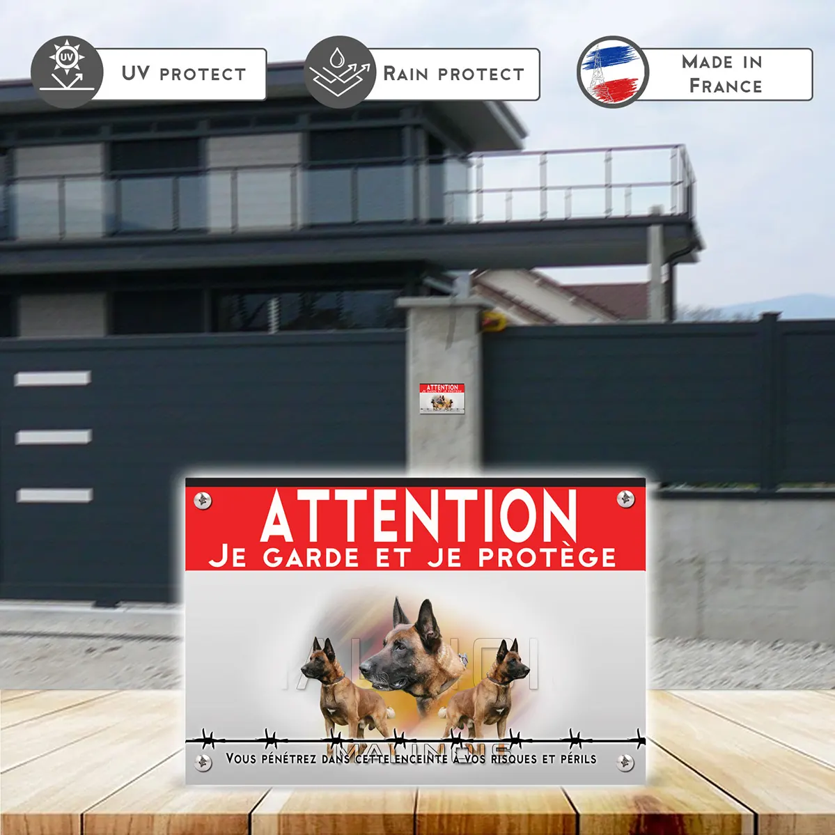 La plaque « Attention au chien » présente un fond dégradé élégant, oscillant entre des tons de beige et de gris, créant une ambiance douce et accueillante. En haut, le texte en lettres capitales blanches sur fond rouge : « ATTENTION JE GARDE ET JE PROTÈGE » attire l’œil. Deux illustrations de malinois, l’une en profil et l’autre de face, illustrent parfaitement les caractéristiques de cette belle race. Leur posture alerte et leurs oreilles dressées expriment leur nature vigilante. En bas de la plaque, un message percutant sur fond barbelé complète ce visuel, offrant une clarté et une lisibilité exceptionnelles.