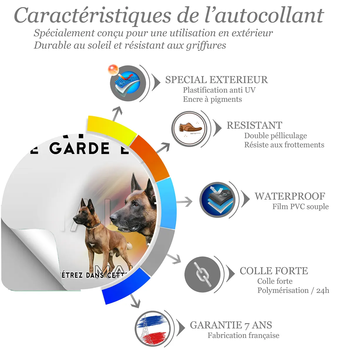 - Illustration réaliste du Malinois Militaire : une image fidèle qui authentifie la présence de votre compagnon et renforce l’effet de prévention.