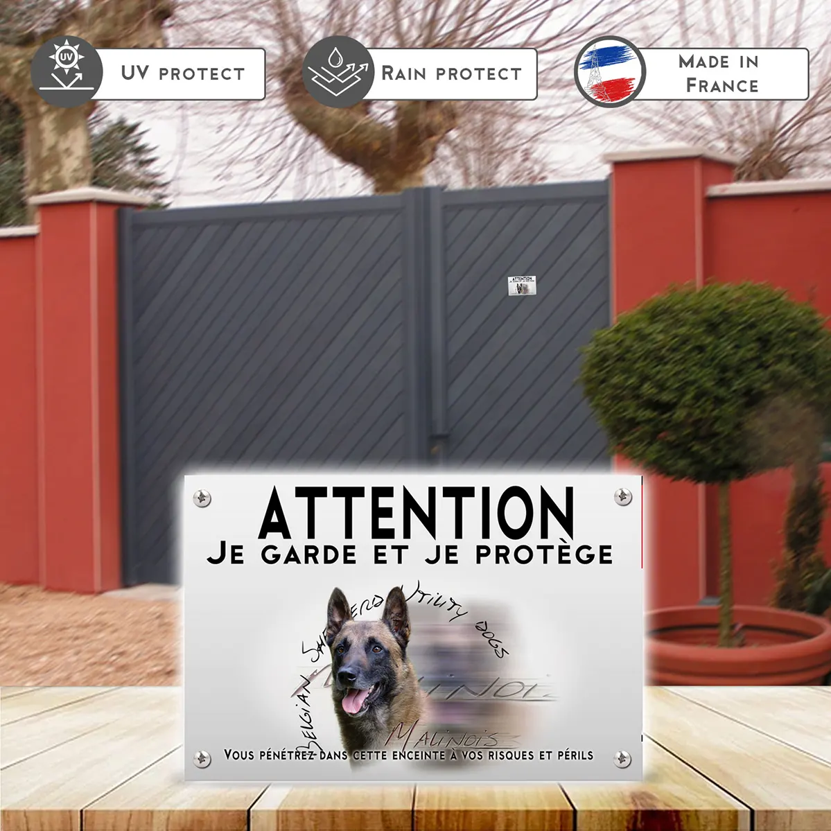 Le malinois de ring est un chien d’origine belge, réputé pour son intelligence et son énergie. Ce chien de travail se distingue par son tempérament vigilant et son dévouement incroyable à sa famille. Amoureux de son foyer, il sait allier l’instinct de garde à une doucœur familiale qui le rend doux et protecteur avec les siens. Avec ce panneau attention au chien malinois de ring, vous valorisez le rôle de dissuasion douce et respectueuse de votre fidèle compagnon.