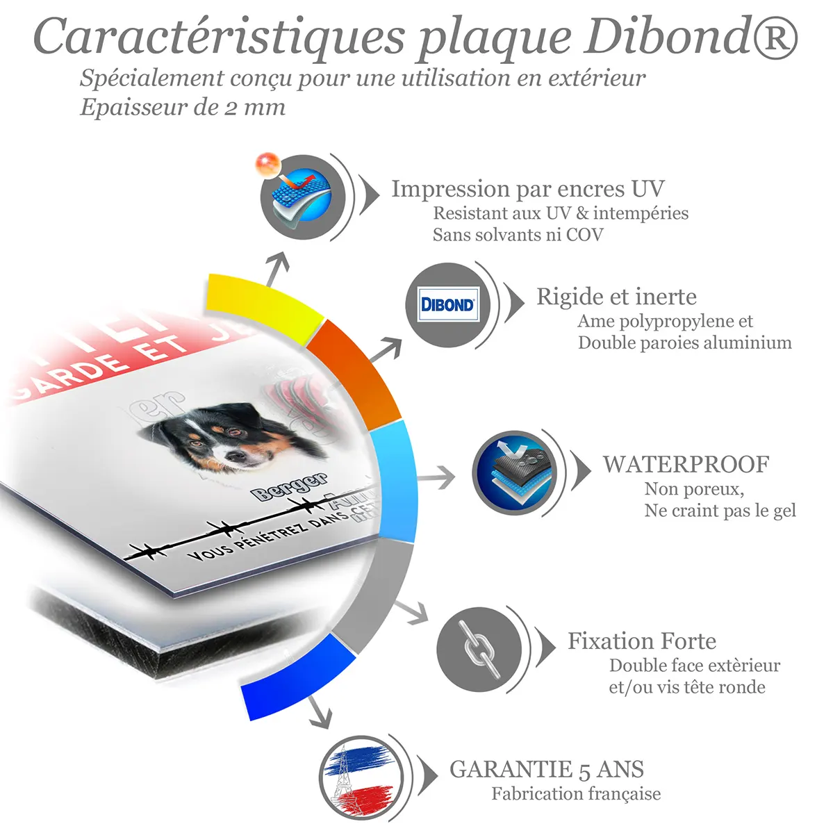 Affichez avec force et élégance la présence de votre Mini Berger Australien. Ce panneau Attention au Chien Mini Berger Australien de la Gamme Impact, disponible en métal Dibond et autocollant résistant aux intempéries et imprimé en UV, offre un contraste puissant pour une lisibilité immédiate et une dissuasion polie à l’entrée.