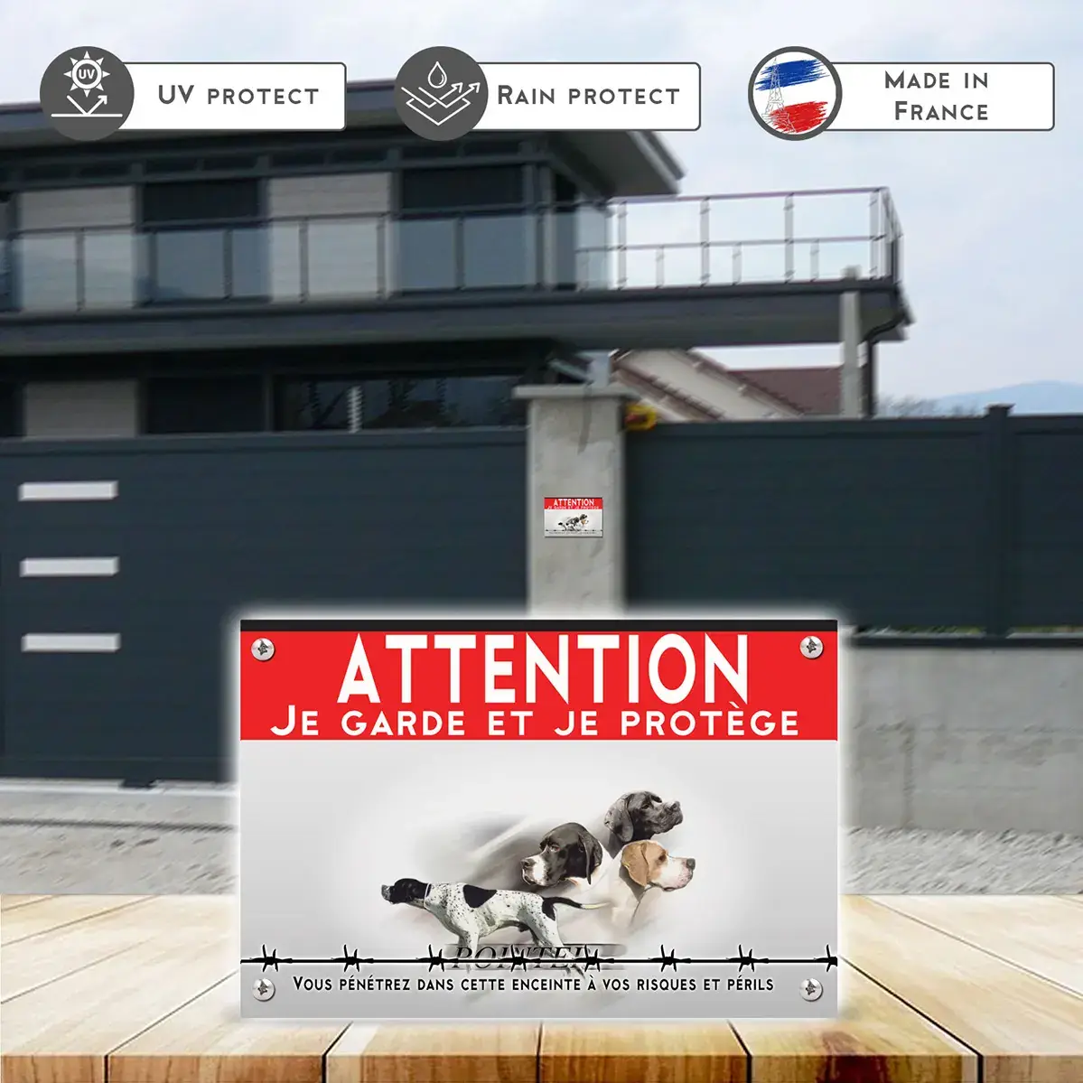 La plaque « Attention au chien » présente une ambiance dynamique et protectrice. Dominée par un fond rouge vif, elle arbore le texte « ATTENTION JE GARDE ET JE PROTÈGE » en lettres blanches, attirant instantanément le regard. Quatre portraits de Pointer anglais en mouvement renforcent l’idée de vigilance. Grâce à la lisibilité et à la clarté du message, ce panneau attention au chien pointer anglais s’impose comme un gardien visuel de votre espace.