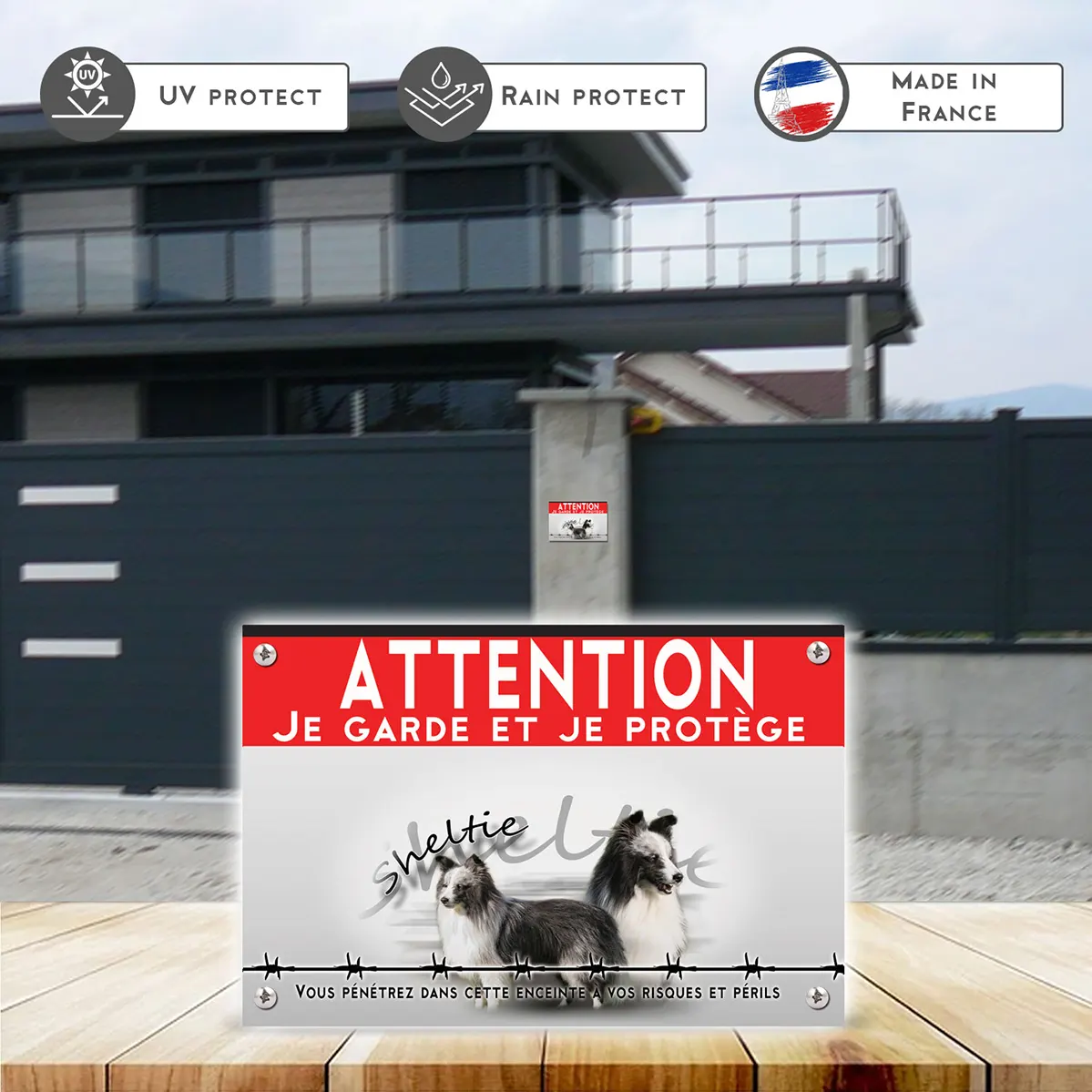 La plaque « Attention au chien » présente des Shetland Sheepdogs sur un fond graphique harmonieux. Le contraste du fond gris clair avec l’en-tête rouge vif et le texte blanc assure une lisibilité optimale. Les illustrations des chiens, avec leurs couleurs noires et blanches, sont saisissantes et rappellent leur dynamisme et leur vigilance. Le message « Je garde et je protège » est clairement affiché, renforçant le rôle de ces précieux gardiens.