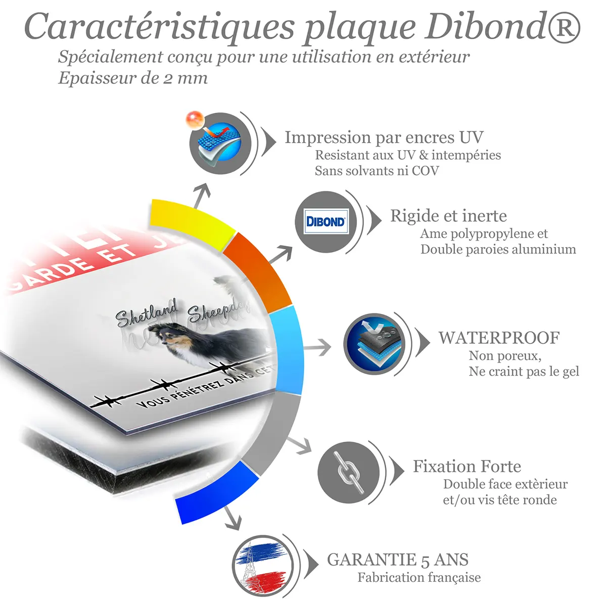 Affichez avec force et élégance la présence de votre Shelty. Ce panneau Attention au Chien Shelty de la Gamme Impact, disponible en métal Dibond et autocollant résistant aux intempéries et imprimé en UV, offre un contraste puissant pour une lisibilité immédiate et une dissuasion polie à l’entrée.