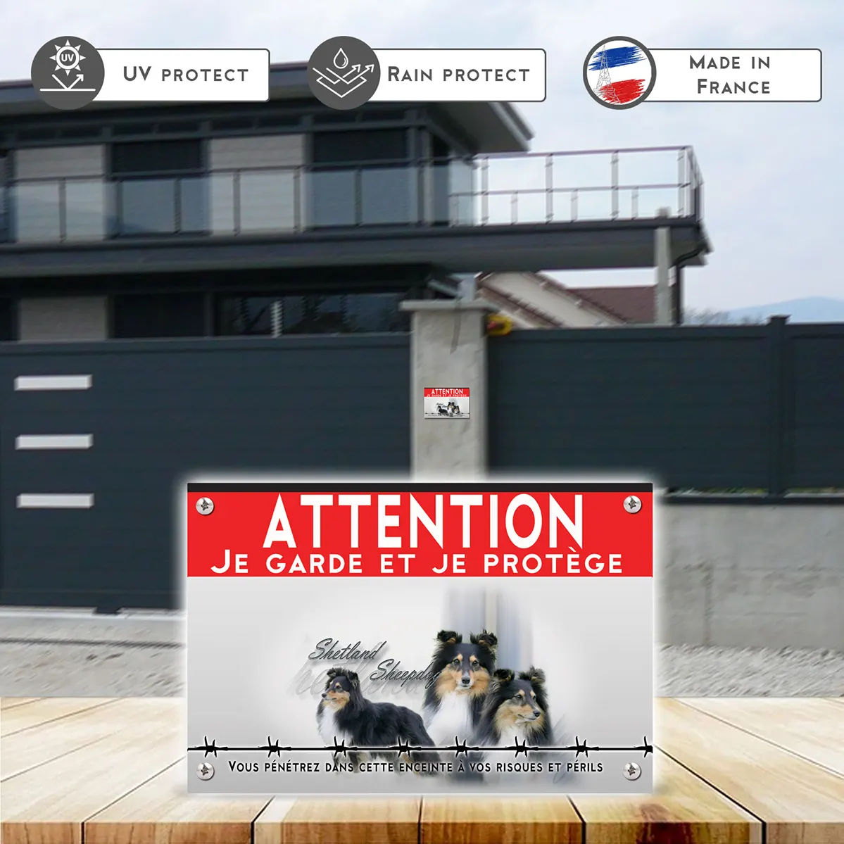 Le **Shetland** est un chien à l’âme noble, reconnu pour son instinct de garde et sa vigilance naturelle. Originaires des îles Shetland, ces chiens robustes affichent des qualités exceptionnelles de protecteurs tout en étant profondément attachés à leur famille. Leur impressionnant équilibre entre un fort instinct de protection et une doucœur familiale fait d’eux des gardiens idéaux. Ce panneau attention au chien renforce ce rôle, en offrant une dissuasion douce et respectueuse qui valorise leur nature protectrice.