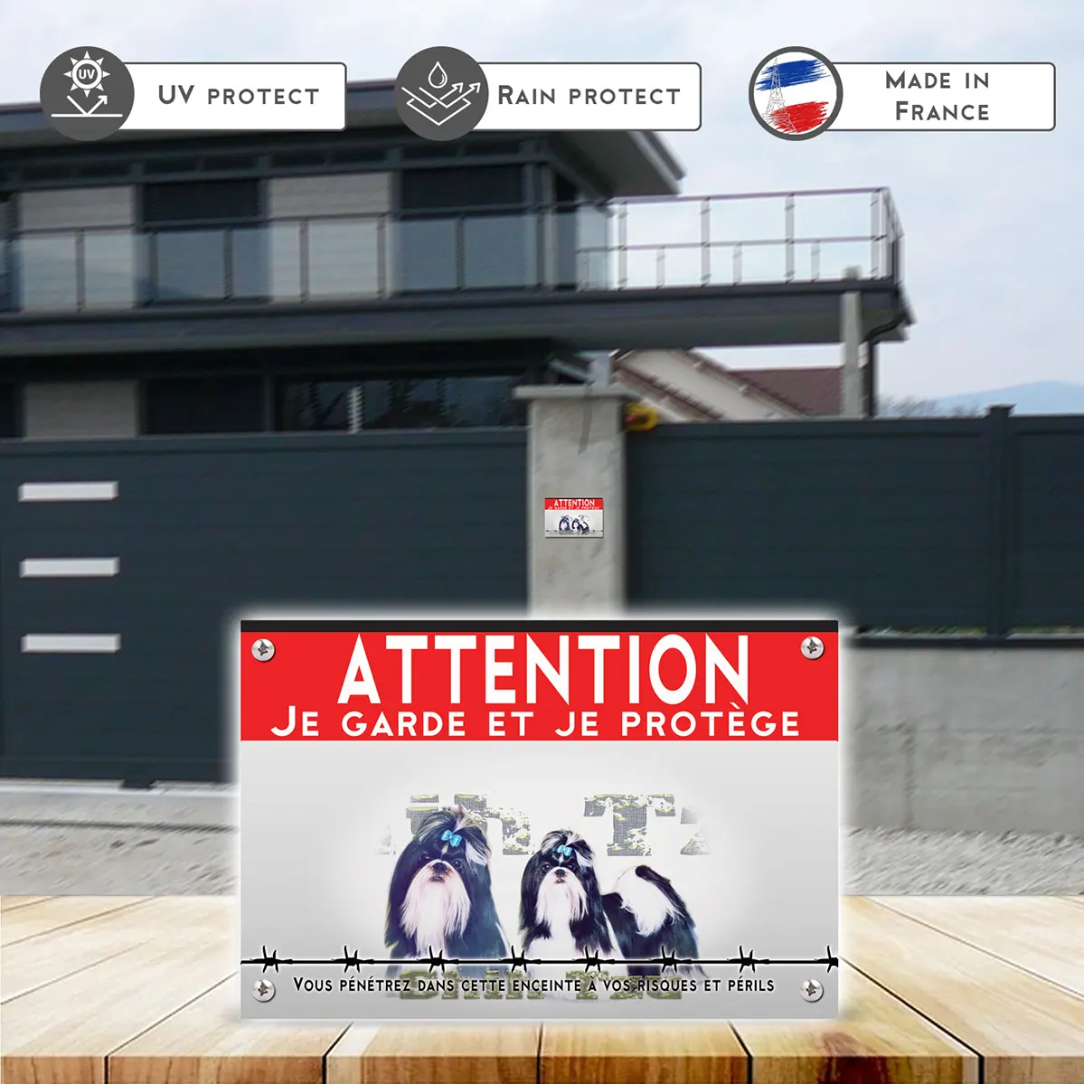 La plaque “Attention au chien” met en avant deux Shih Tzu au pelage noir et blanc. Leurs coiffures élégantes sont accentuées par de jolis nœuds bleus, ajoutant une touche de charme à leur apparence. Les chiens sont placés sur un fond clair, ce qui les fait ressortir visuellement. La partie supérieure de la plaque est dominée par un bandeau rouge sur lequel est inscrit en blanc « ATTENTION » suivi de « Je garde et je protège ». En dessous des chiens, un fil barbelé ajoute un aspect sécuritaire à l’avertissement. En bas, un texte mentionne : « Vous pénétrez dans cette enceinte à vos risques et périls », renforçant le message de prudence. La lisibilité et la clarté du message “panneau attention au chien” sont indéniables.