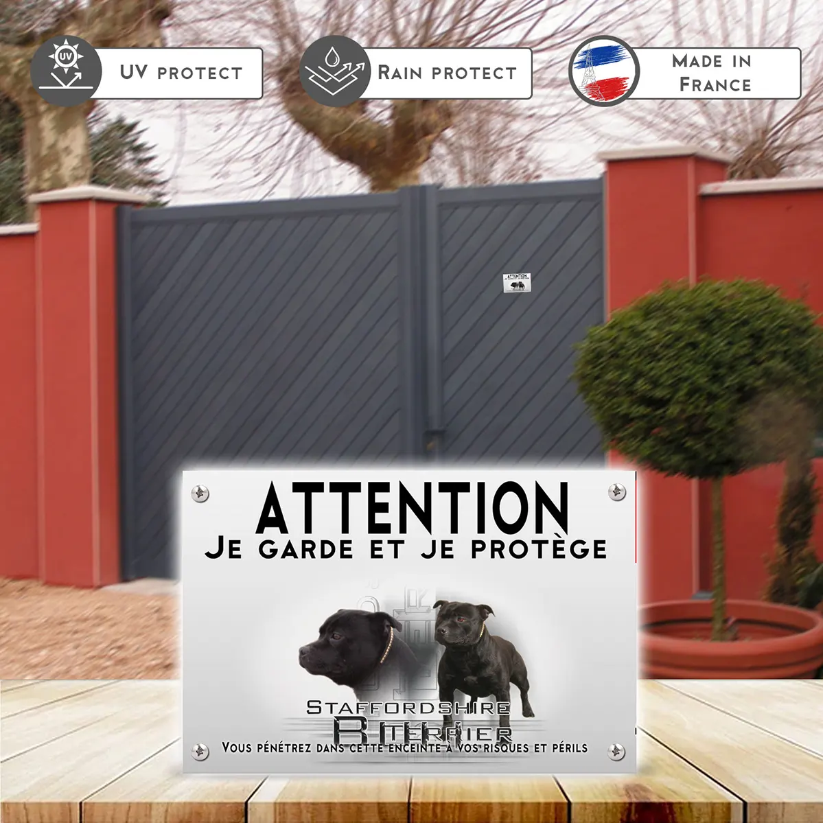 Pour en savoir plus sur notre gamme de plaque Attention au Chien Staffie Noir.